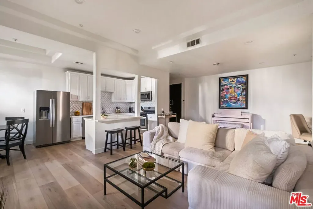Welcome to this beautifully updated corner rear 2-bedroom, 2-bathroom condo just moments from Hancock Park and Larchmont Village, offering 1,180 SF of bright, open living. The thoughtfully designed layout connects the living, dining, and kitchen areas, creating a space that feels open and inviting. Large windows and sliding glass doors bring in natural light and open to a private patio, enhancing the indoor-outdoor flow. Elevated above street level, the unit offers added privacy while still maintaining convenient access. The kitchen is clean and modern, featuring quartz countertops, a herringbone backsplash, stainless steel appliances, and bar seating ideal for casual dining and entertaining, plus a built-in desk for a convenient work-from-home setup. Both bedrooms are generously sized with walk-in closets, and the primary suite offers direct patio access and an en-suite bathroom with dual vanities, a soaking tub, and a separate shower. Additional features include a dedicated laundry room with storage, new flooring throughout, recessed lighting, a decorative fireplace, and a new HVAC system. The secure building offers gated parking with two tandem spaces and guest parking. A well-designed, move-in-ready home in a central, highly desirable location.