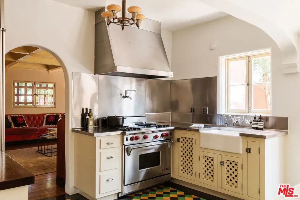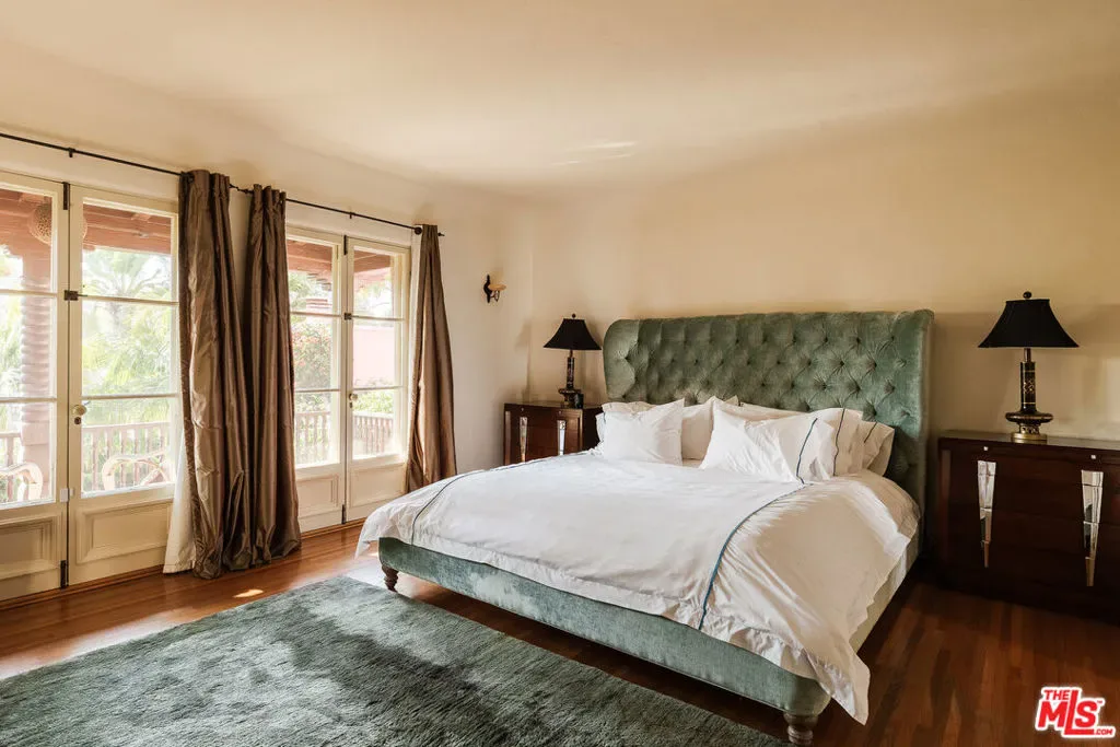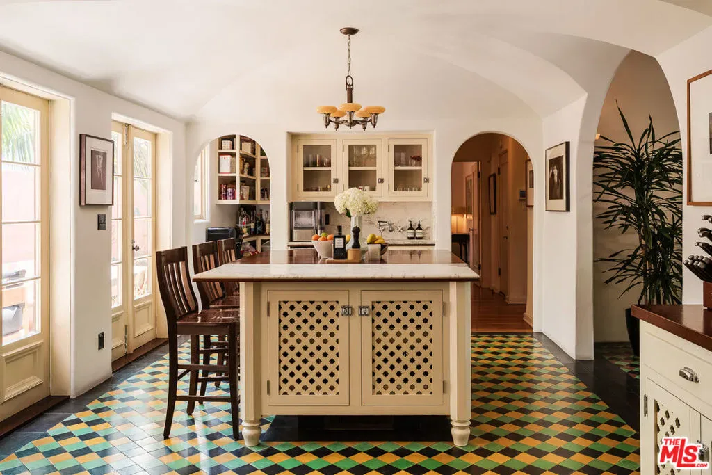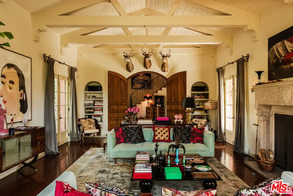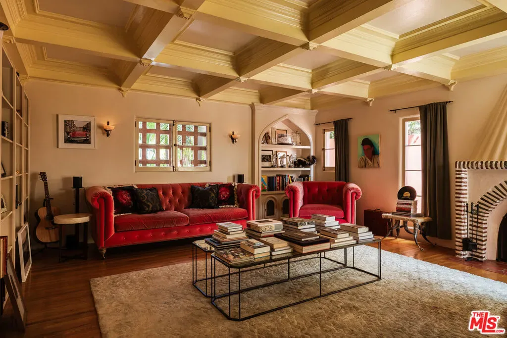 Grand-scale 1928 Spanish villa with a distinct Moorish flair, rich in original detail and unforgettable character. Privately gated and secure with cameras, this romantic Los Feliz residence features one of the most dramatic baronial entry staircases you’ll ever see, complete with stained glass windows and a minstrel’s balcony. The spectacular step-down living room showcases vaulted beamed ceilings, a fireplace, arched windows, and inlaid pegged wood plank floors. A beautiful formal dining room overlooks the lushly landscaped gardens and pool, while the gourmet kitchen with center island and walk-in pantry opens to a sunny, private patio. The den/family room offers a coffered ceiling, fireplace, and custom cabinetry. Throughout the home are graceful arches, French doors and windows, decorative ironwork, recessed shelving, balconies, original bath tile, and period fixtures and finishes. Three bedrooms and an office are upstairs, including a spacious primary suite with ample closet space and a lovely balcony, plus one bedroom downstairs. A rare and beautifully maintained romantic Spanish town villa with huge rooms, timeless elegance, and extraordinary architectural presence.