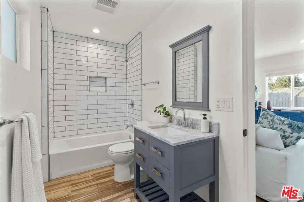 Incredible opportunity to own a newly reimagined property featuring a beautifully renovated single-family home and a fully permitted 1-bedroom, 1-bath ADU on one of the most desirable streets in Eagle Rock. The front residence began as a charming Craftsman bungalow and has been thoughtfully expanded into a spacious 4-bedroom, 3-bath home that blends classic character with modern comfort. The second-story primary suite features soaring ceilings, a walk-in closet, and a luxurious bathroom with spa tub, glass-enclosed shower, and dual vanity. The main level offers an open layout with seamless flow between the kitchen, dining, and living areas, plus a versatile den ideal for a home office or media room. Three additional bedrooms and two bathrooms provide flexibility for family, guests, or workspace. At the rear of the property sits a newly constructed and fully permitted 1-bedroom, 1-bath ADU with its own private fenced yard, patio, and sauna creating a peaceful retreat. Built above the two-car garage, the bright and spacious unit features an open living area, full kitchen, comfortable bedroom, and beautifully finished bath. The two-car garage offers additional flexibility and could serve as a home office, gym, creative studio, or potential future ADU conversion (buyer to verify). A rare turnkey property offering modern living, outdoor amenities, and income potential in one of Northeast LA’s most sought-after neighborhoods.