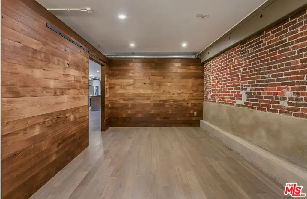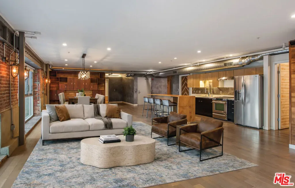 Located within the historic Barker Block Arts District lofts, Unit 202 is the largest residence in the building, offering 2,020 square feet. This thoughtfully remodeled 2 bedroom, 2 bathroom loft blends authentic warehouse character with refined modern updates, set within one of Downtown LA’s most iconic live/work communities. With its scale, light, and creative layout, Unit 202 is an inspiring environment for artists, designers, and anyone seeking a true live work loft in Downtown Los Angeles. The open floor plan is anchored by a centrally positioned kitchen that connects seamlessly to expansive living and dining areas, creating an inviting layout ideal for both everyday living and entertaining. Tall ceilings and oversized windows flood the space with natural light throughout. Wood flooring runs through the main living areas, complemented by tiled bathroom floors, original red brick walls, exposed heavy timber beams, lime washed walls, and upgraded lighting fixtures tastefully selected to complement the industrial architecture. The kitchen features custom built wood cabinetry with soft close drawers, a live edge wood island, Jenn Air gas range, LG refrigerator, quartz countertops, and generous storage. A custom built wood Murphy bed allows the space to comfortably host guests while maintaining openness and flexibility. The second bedroom offers privacy and versatility, well suited as a bedroom or home office. Additional highlights include a large walk in closet with custom built ins, integrated projector and screen, and in unit washer and dryer. Barker Block offers a full suite of amenities including a resort style rooftop with pool, spa, cabanas, BBQ areas, fire pits, landscaped courtyards, and a fitness center with large pocket doors opening to sweeping LA skyline views. Assigned parking is located within the building’s gated garage, with common area WiFi and 24/7 on site security. Located directly across the street from Urth Caffe and Arts District Park, and moments from SoHo Warehouse, the property sits at the center of one of Downtown Los Angeles’ most walkable and culturally rich neighborhoods, surrounded by an eclectic mix of acclaimed dining and coffee destinations including Bestia, Bavel, Girl and the Goat, Arts District Brewing Company, Verve Coffee, and Blue Bottle, along with art galleries, boutiques, and creative spaces that define Arts District living.