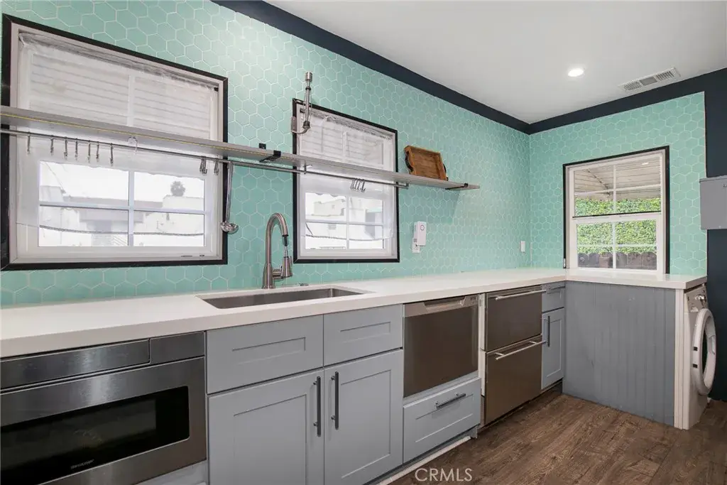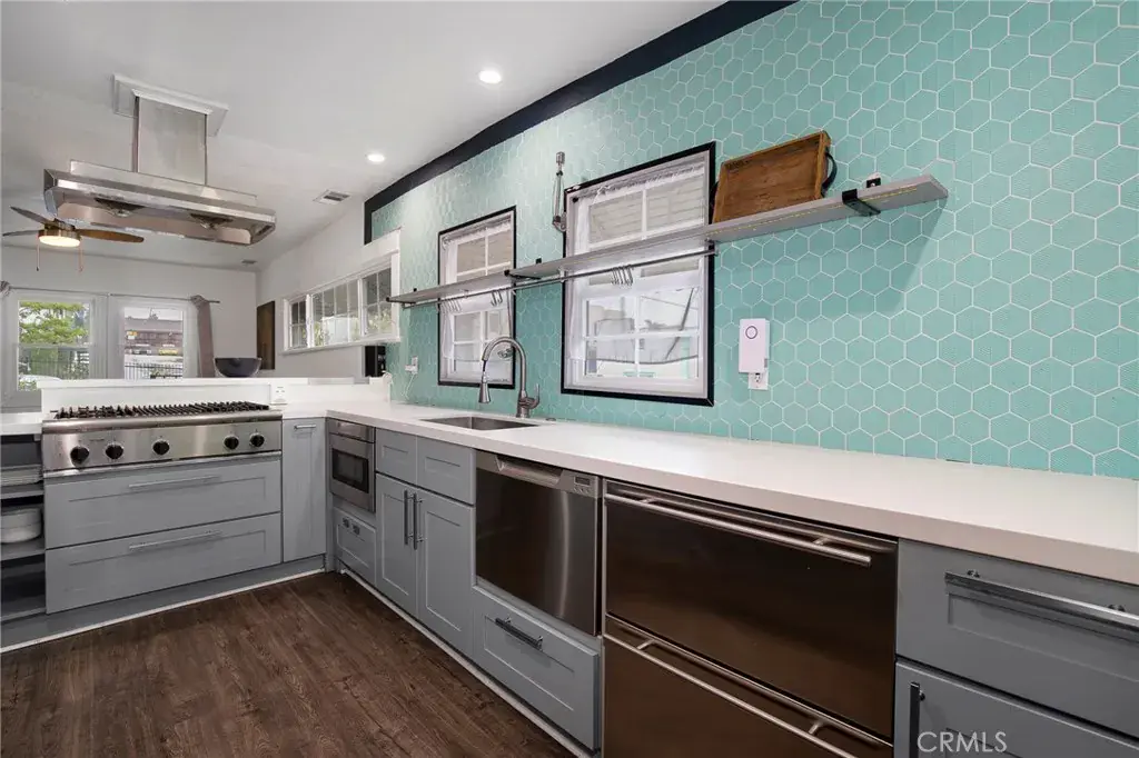 The spacious, remodeled kitchen features high-end appliances, including a Thermador 36-inch Professional stainless 4-burner gas range top with grill, Miele refrigerator, Fisher & Paykel dishwasher, and Sub-Zero sliding refrigerator and freezer. The updated 1.75 baths showcase beautiful finishes, while the cozy breakfast nook can easily double as a home office. Additional highlights include natural hardwood floors in the living room and bedrooms, new tile flooring, copper plumbing, a tankless water heater, subway tile accents, and a convenient in-unit washer and dryer.