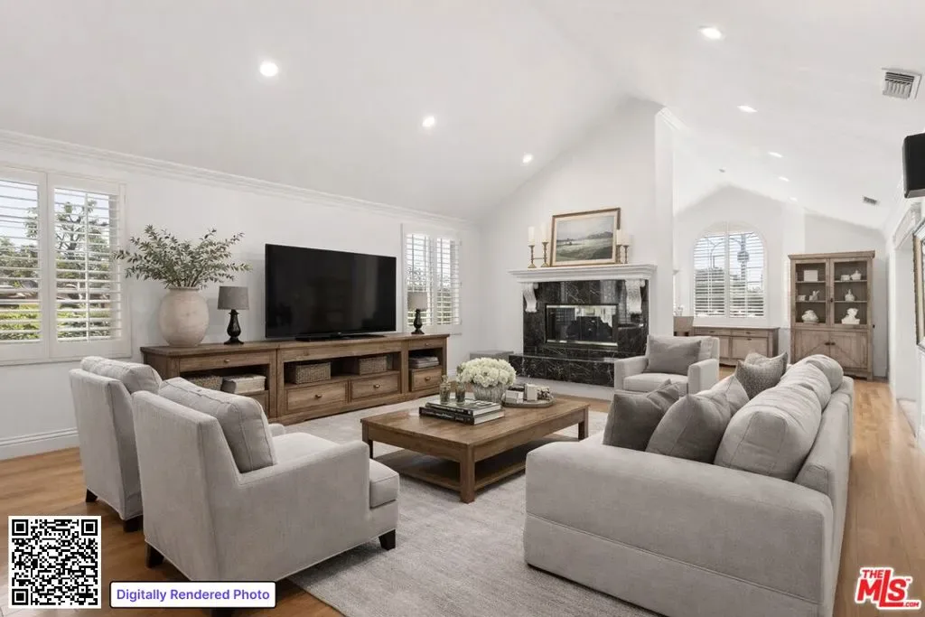 Welcome to this inviting Westchester residence, thoughtfully designed for comfort and effortless everyday living. This single-level home offers a beautifully considered layout that balances openness with privacy. The formal living room, highlighted by an oversized front window that fills the space with natural light, flows seamlessly into the family room, with the two spaces thoughtfully divided by a striking two-sided fireplace. Soaring vaulted ceilings extend across both rooms, creating an airy sense of scale while the shared fireplace adds warmth, character, and architectural interest at the heart of the home. Plantation shutters throughout provide elegant light control and privacy. The galley kitchen flows seamlessly from the living areas, offering stainless steel appliances, a dishwasher, microwave, refrigerator, and disposal. A cozy dine-in area makes everyday meals feel special, while two sun tubes overhead brighten the space naturally throughout the day. Tile flooring extends from the welcoming foyer, distinguished by an elegant compass-pattern inlay, through the kitchen, creating continuity and polish. This 4-bedroom home includes two ensuite bedrooms positioned on opposite sides for optimal privacy, ideal for guests, multigenerational living, or a home office. The guest suite boasts vaulted ceilings, a walk-in closet, bidet, and Jacuzzi tub/shower. The primary suite is a serene retreat with vaulted ceilings, skylight, fireplace, built-in armoire, and his-and-her walk-in closets. Two additional bedrooms offer flexible space, served by a hallway bath with tub/shower and built-in linen storage. A central courtyard connects multiple rooms, opening to a charming brick patio perfect for outdoor dining and relaxation. The walled-in private backyard offers complete seclusion. Situated on a corner lot, the property includes a detached two-car garage and eco-friendly upgrades including an owned solar system, water softener, and reverse osmosis system.