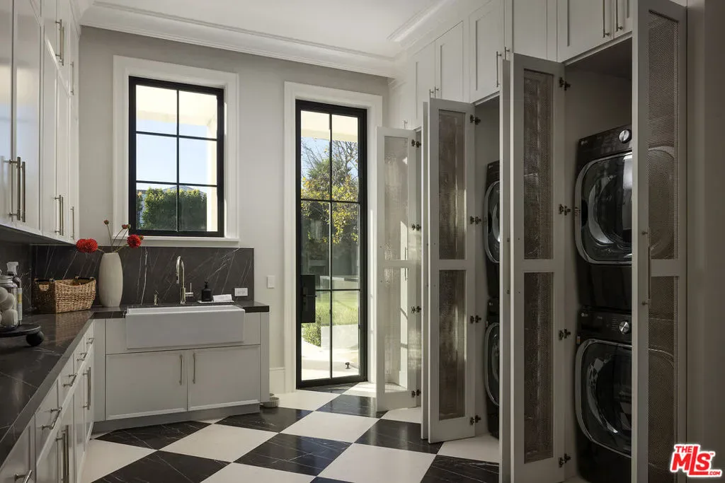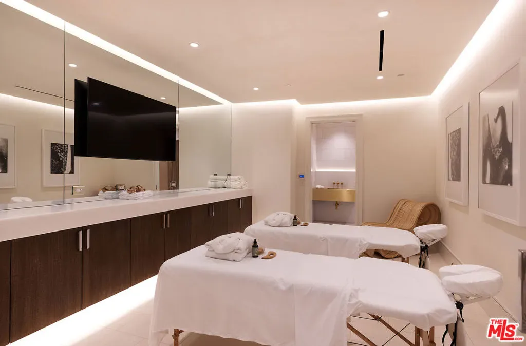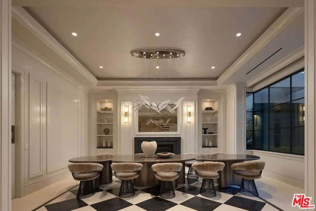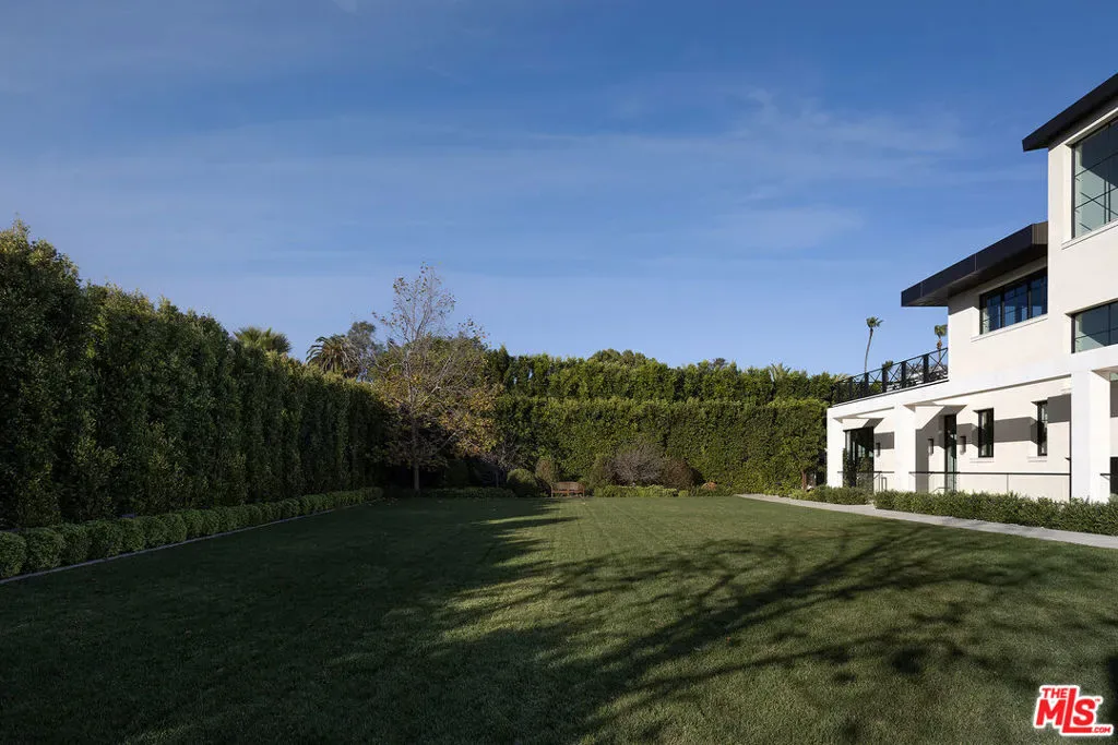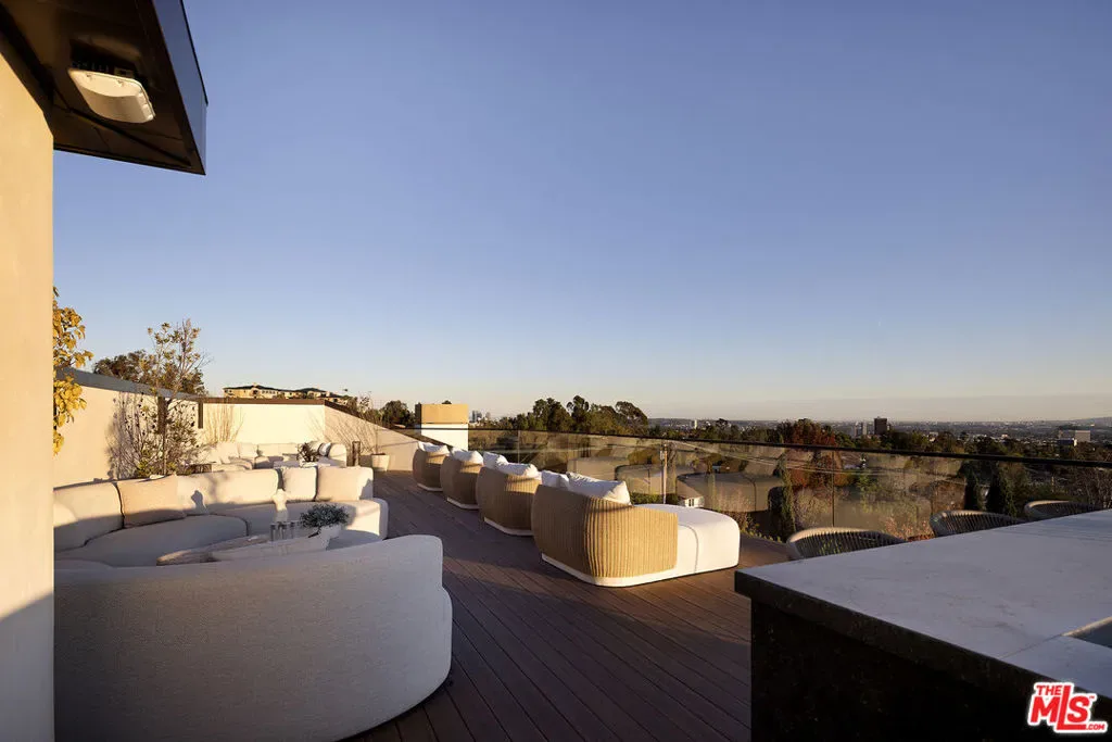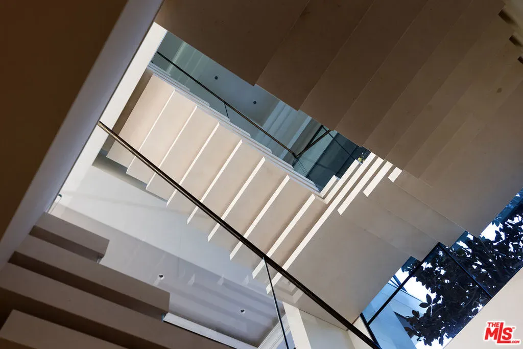 Envisioned by architect to the stars Philip Vertoch and crafted alongside award-winning, AD100-named design studio Ingrao Inc, The Bonhill represents a masterclass in blending architectural precision with timeless style. Concealed behind privacy gates with mature hedges lining its perimeter, this immaculate ocean-view estate includes multiple outdoor terraces offering spectacular panoramas, a sprawling grassy lawn, and premier amenities composed of fine materials. An impressive foyer provides a sense of continuous space with its floating limestone staircase as centerpiece, each step repeating in soft, rhythmic progression. An elegant dual-sided Cristallo marble fireplace partitions the formal living room and nearby parlor with stylish marble wet bar as soothing breezes waft through paned French and pocket doors. The true marvel of the home is its culinary center, a fusion of Farmhouse and transitional forms, a blissful yet understated display of calming hues and varied texture, optimized for casual indoor-outdoor living and entertaining. There are two center islands, custom-fitted designer cabinetry, wine refrigeration, chef-grade Gaggenau and Sub-Zero appliances, and preparation kitchen. Both the formal dining room and the library are nods to traditional, classic style. Upstairs, the owner’s suite opens to a vast patio with incredible views of the Pacific, Catalina Island, treetops, mountains, and urban sprawl. Its sleek, spa-inspired bath includes a soaking tub, oversized shower, makeup desk, toilet room, and dual-sink vanity. There are also two walk-in closets and a secondary en-suite marble-clad bath. From the spacious rooftop deck, serve party guests, barbecue and serve light bites, and recline with fantastic vistas as backdrop. For lazy mornings and warm afternoons, a pajama room transitions to a sunny travertine balcony surrounded by lush greenery, reminiscent of summers abroad. Standout luxe amenities include a state-of-the-art gym, theatre with refreshment bar, art gallery, wine tasting/cigar lounge, and wellness spa with steam shower, massage room, and dry sauna. An elevator connects all levels. Outside, lounge poolside under open-air verandas and meditate in peaceful gardens. The pool includes a baja shelf and accompanying cabana with bar and shower. The long pebble driveway leads to a finished subterranean garage affording parking for eight vehicles, bringing the grounds’ total capacity to 17 or more. Relish an idyllic, peaceful existence positioned in Brentwood’s Bonhill-Tigertail estates section, one of the world’s most sought-after, celebrity locales.