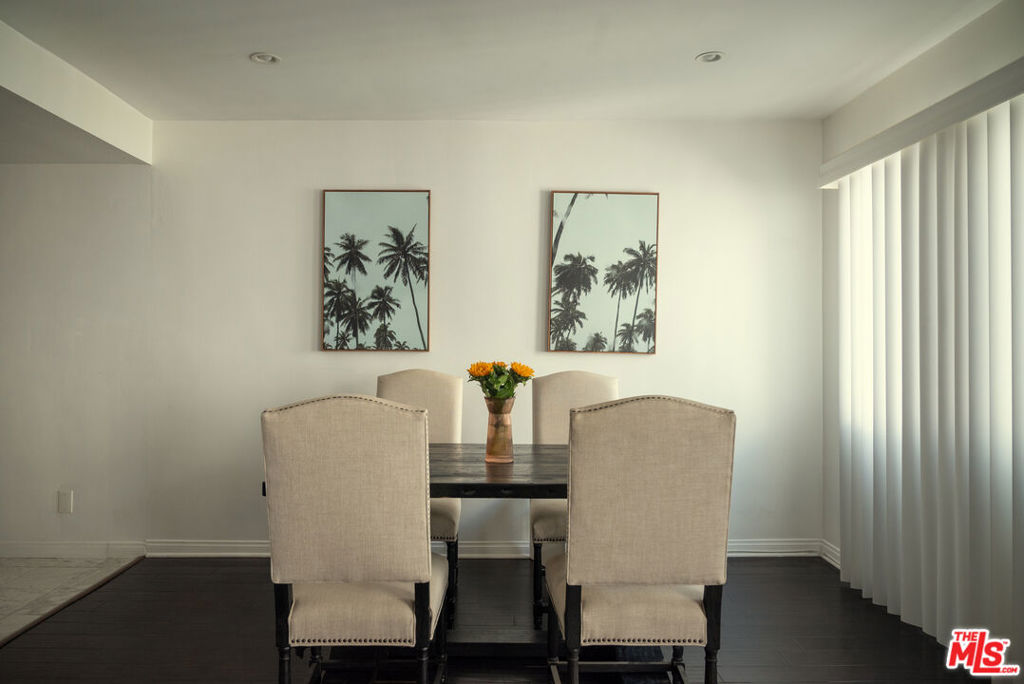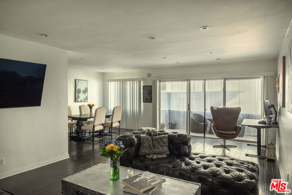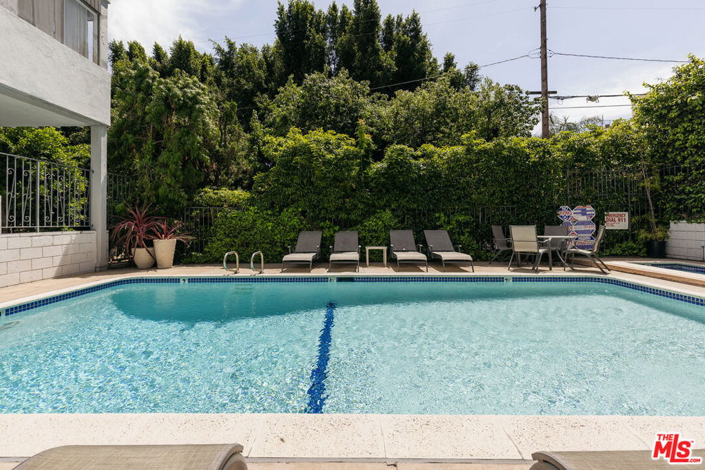 Oversized, quiet, and private single story flat nestled in the Hollywood hills walking distance to Runyon Canyon and Sunset Blvd, best value in the area. Hidden on a shady street amongst the trees in a mid century building with a pool and spa by the Outpost Estates and Nichols Canyon, the home features a classic double door entrance into a large living space with balconies off the living room and both bedrooms. Adjacent to the formal dining area is a spacious kitchen with quartz countertops and stainless steel appliances. The primary bedroom suite has en suite bathroom with double vanity and built out walk-in closet. Second guest bedroom features its own sliding glass door and balcony, with a second full bathroom and hallway storage completing the home. The flat comes with two side-by-side parking spaces, ample storage, and community laundry (in-unit laundry can be added with HOA approval). The boutique building features a pool and spa surrounded by mature trees and foliage for privacy. Incredible location just steps to the entrance of Runyon Canyon and just a short walk to Wattles Park, shops and restaurants on Sunset Boulevard, the Hollywood Bowl, Magic Castle, and Roosevelt Hotel. Great space and value in the tree-lined Hollywood Hills.