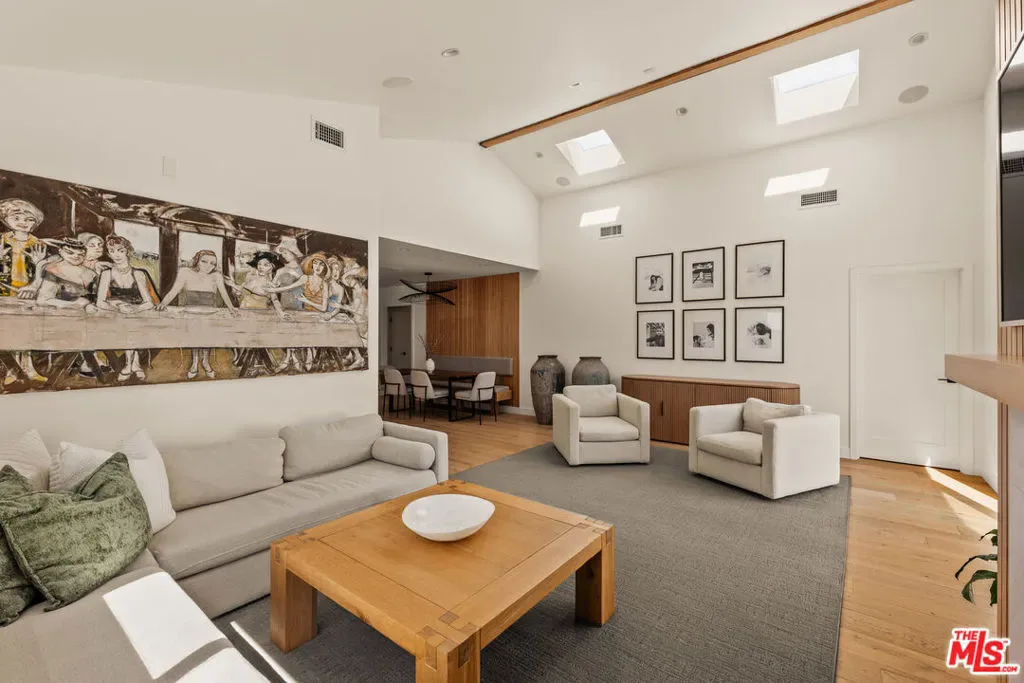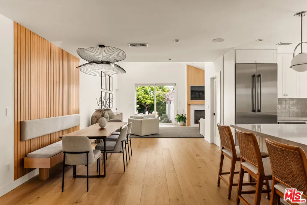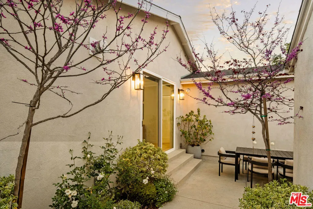 Tucked within the most coveted pocket of Upper North Kentwood, this truly one-of-a-kind residence offers a rare blend of inspired design, modern luxury, and exceptional versatility. Fully renovated and thoughtfully reimagined just a few years ago, this 4-bedroom, 2.5-bathroom home plus a studio ADU presents an extraordinary opportunity in one of the Westside’s most sought-after neighborhoods. A pristinely manicured, landscaped front yard sets a refined first impression, guiding you along a charming path to the welcoming Dutch door entry. Inside, a custom built-in bench creates an elegant and functional foyer moment before the home opens into an expansive, light-filled floor plan. Wide white oak flooring flows seamlessly throughout, enhancing the home’s warmth and cohesion. Walls of glass draw the outdoors in, extending the living experience effortlessly to the private backyard beyond. Designed for both daily living and elevated entertaining, the chef’s kitchen stands as the heart of the home. Outfitted with a Thermador double oven, a six-burner range with pot filler, and a generous center island with breakfast counter, this space balances performance with beauty. A full-size pantry and utility closet ensure exceptional functionality, while the adjacent dining area, framed by a striking wood-paneled accent wall, overlooks the inviting living room. Grand in scale, the living room features vaulted ceilings with skylights that bathe the space in natural light. A gas fireplace with built-in shelving anchors the room, while glass doors open directly to the dining patio and lush backyard, creating effortless indoor-outdoor flow. The outdoor retreat offers complete privacy, enveloped by mature trees, lush hedging, and thoughtfully curated garden beds. A spacious dining patio transitions to a grassy yard, ideal for alfresco gatherings or tranquil mornings in the sun. Back inside, the primary suite serves as a serene sanctuary, complete with vaulted ceilings, a walk-in closet, and a spa-inspired ensuite featuring a steam shower. Three additional bedrooms, a full bathroom, and a powder room provide comfort and flexibility for family and guests. Modern living is elevated in this fully integrated smart home featuring automated lighting, built-in indoor and outdoor speakers, wi-fi inside and out, camera monitoring systems and 220V wiring at the driveway for EV Charging. The detached ADU enhances the property’s versatility with its own kitchen and breakfast counter, walk-in closet with laundry, and full bathroom, perfect for guests, extended family, or income potential. A gated driveway ensures added privacy and security, while accommodating four or more parking spaces with ease. This exceptional Upper North Kentwood offering captures the essence of refined California living, private, polished, and truly unforgettable.