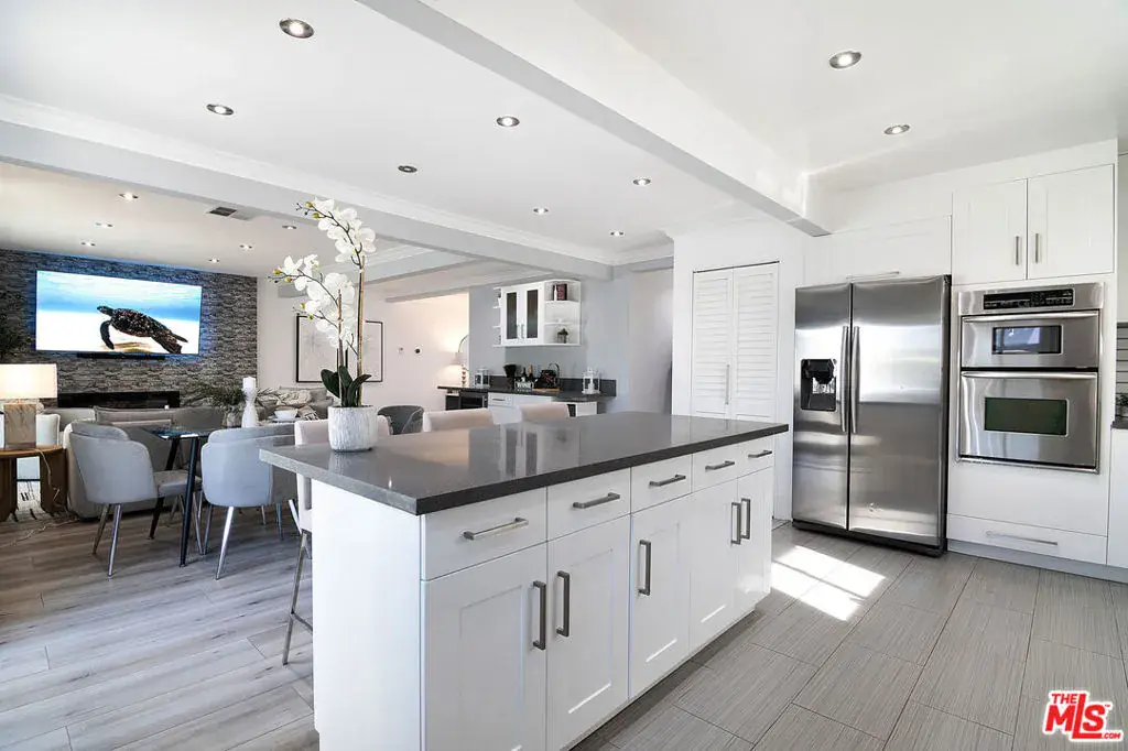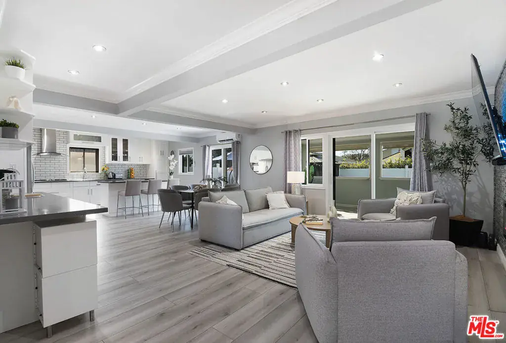 Beautifully fully remodeled 3-bedroom, 2-bath home in the heart of Westchester offering exceptional indoor-outdoor living. The open-concept layout features wide-plank flooring, crown molding, tray ceilings with recessed lighting, and a dramatic stacked-stone fireplace. The chef’s kitchen includes custom cabinetry, quartz countertops, stainless steel appliances, gas cooktop, double ovens, large center island, and a built-in serving station ideal for entertaining. Sliding glass doors open to a spacious enclosed patio or sunroom with finished flooring, paneled ceiling, and screened windows, perfect as a bonus living area, office, or lounge. The primary suite offers custom wardrobe doors and a spa-inspired bath with soaking tub, rain-style shower, and built-in TV. The secondary bath features a frameless glass walk-in shower with designer tile. The private backyard is designed for low maintenance and entertaining with expansive paver patios, artificial turf, drought-tolerant landscaping, mature citrus trees, string lighting, and a covered outdoor kitchen with stone island and stainless steel BBQ. Additional highlights include EV charging, upgraded hardscaping, and an ultramodern garage. Ideally located near LAX, beaches, freeways, and dining. Turnkey Westchester living at its finest. Call anytime to view this home. Don’t miss the opportunity to make this exquisite property yours!