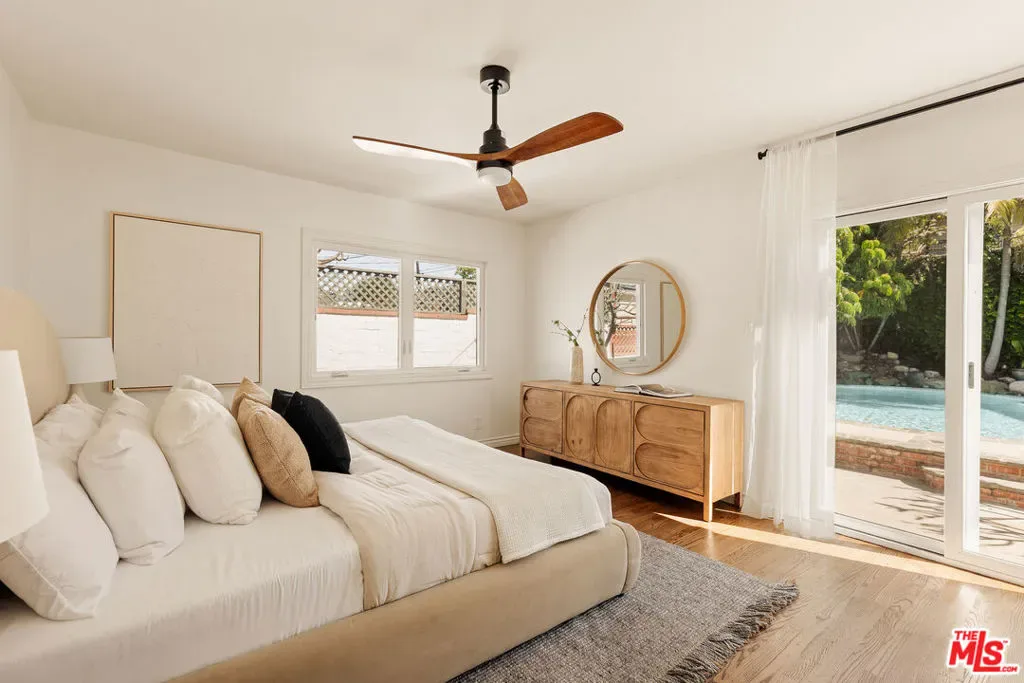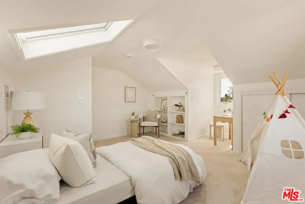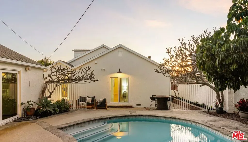 Set within the highly sought-after Kentwood Elementary school district, this thoughtfully updated four-bedroom, two-bathroom home offers a flexible layout, inviting living spaces, and a backyard designed to be enjoyed. With two bedrooms and two bathrooms on the main level, including a well-appointed primary suite, the home is well suited for a variety of living arrangements. The main floor is filled with warm west-facing light, creating an inviting atmosphere in the living room, where built-in bookshelves and a wood-burning fireplace serve as a natural focal point. A formal dining area connects to the remodeled kitchen, finished with custom gray cabinetry, ample counter space, and a subway tile backsplash. Double ovens, a smart refrigerator, and an eat-at peninsula with pendant lighting and a wine refrigerator make the space as functional as it is welcoming. Just beyond, the family room offers additional flexibility with built-in storage and French doors that open directly to the backyard. Positioned for privacy, the primary suite on the main level opens to the outdoor space and includes a walk-in closet and a remodeled bathroom with dual vanities, gold hardware and fixtures, black and gold hexagonal tile floors, custom wallpaper, and a marble-tiled shower with a rainfall showerhead and built-in niches. A secondary bathroom on this level features a soaking tub and a calming, spa-like feel. Upstairs, two additional bedrooms are filled with natural light and character, enhanced by dormer windows, skylights, and built-in study nooks that create comfortable spaces for work, reading, or play. The backyard is designed for both relaxation and gathering, anchored by a heated pool with a cascading waterfall and surrounded by lush landscaping. The gated driveway and hardscaped areas provide additional room for play, while still offering privacy and separation from the street. A standout feature of the property is the oversized garage, currently set up as a poolside retreat with eight-foot folding doors that open to the yard. Complete with a built-in bar, keg refrigerator with taps, and a projector with screen, it functions as an extension of the outdoor living space. This structure also presents an opportunity for future use as a guest house or potential ADU, or it can be returned to a traditional garage. Moments from the neighborhood’s best schools and around the corner from local grocery stores and shops, this traditional beauty makes everyday living easy.