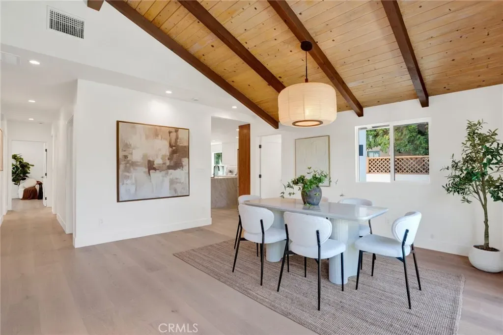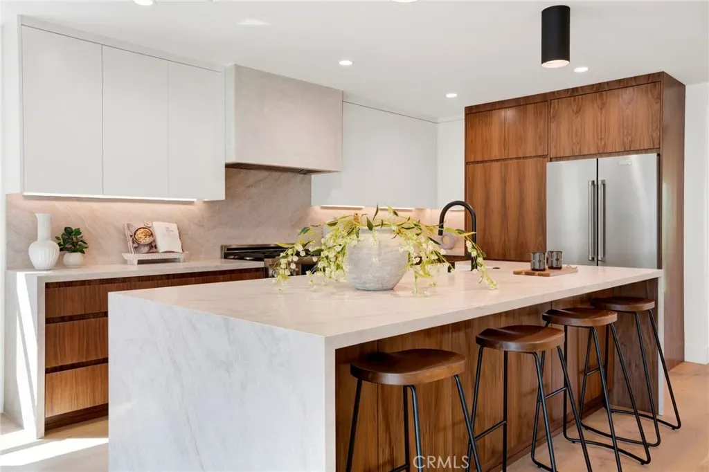 Set on a quiet Westchester street, 8121 Chase Ave has been completely reimagined with a focus on clean architecture, natural light, and elevated, thoughtfully selected finishes throughout. A dramatic vaulted great room anchors the home, framed by exposed wood beams and wide-plank engineered hardwood flooring, creating a warm yet modern living space that feels both open and intentional. Large sliding doors line the back wall, seamlessly connecting indoor living to the private backyard and filling the home with natural light. The kitchen was designed as a true centerpiece—featuring custom walnut cabinetry, a statement waterfall island, integrated appliances, and a refined mix of textures that strike the perfect balance between modern and timeless. Bathrooms carry a spa like feel, highlighted by clean-lined tile work, warm wood vanities, and understated brass accents. Each space reflects a cohesive design approach that feels elevated without being overdone. Beyond the main living areas, a detached 200 sq ft bonus flex space off the back of the garage offers versatility for a home office, gym, studio, or creative workspace—adding meaningful functionality to the property. The exterior mirrors the interior’s design sensibility with smooth stucco, black-framed Milgard windows, and fresh, curated landscaping that gives the home a quiet, confident presence. With a well executed layout, designer finishes, and seamless indoor outdoor flow, this is a home that delivers both style and livability in one of Westchester’s most desirable pockets.