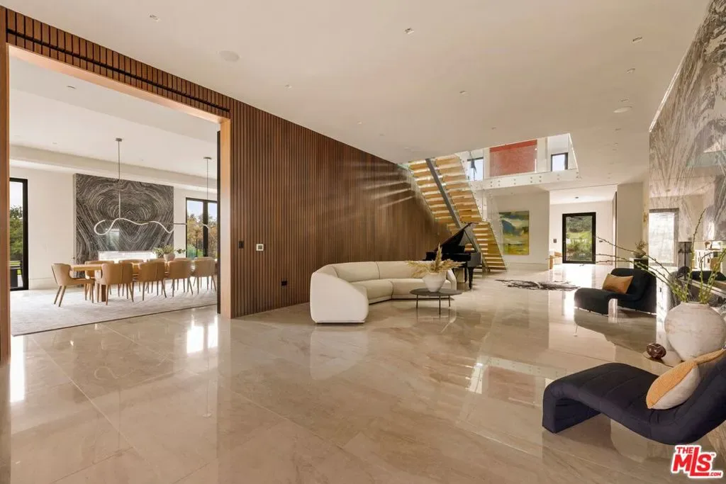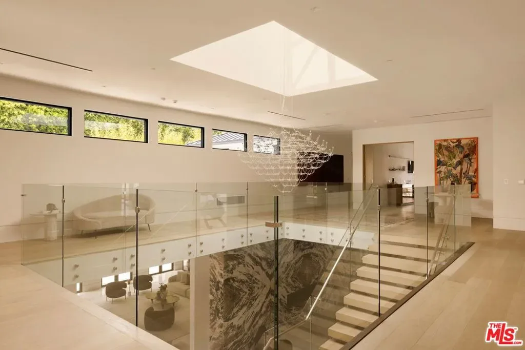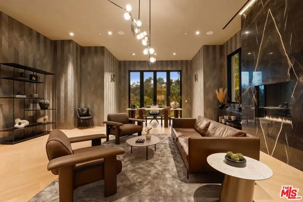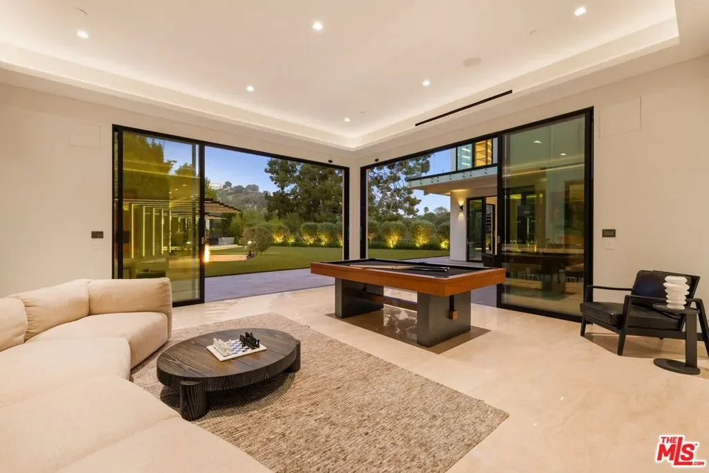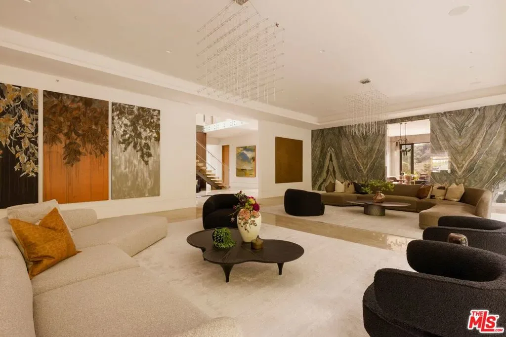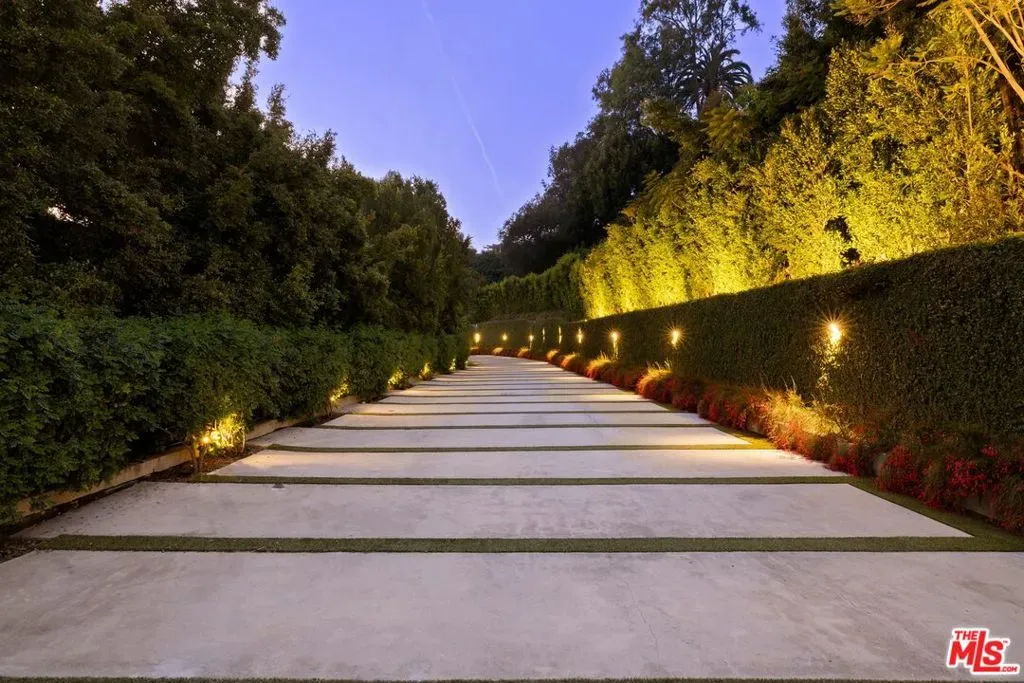 Commanding a private 2.5-acre setting within Crestwood Hills, this newly constructed estate is defined by its scale, architectural clarity, and uncompromising sense of privacy. Concealed behind gates and its own guard house, the property offers a level of seclusion rarely found in Brentwood. A striking double-height arrival sets the tone, where floating staircases, gallery-like volumes, and meticulously selected stone and wood finishes create a refined, modern palette. Light moves effortlessly through the interiors, illuminating expansive living spaces anchored by sculptural fireplaces and walls of glass that dissolve the boundary between indoors and out. The residence is designed with the intention of balancing grand entertaining with quiet retreat. Formal and informal living areas unfold seamlessly, complemented by a private office, a cinema-quality media room, and dining spaces that feel both intimate and architectural. At its center, a statement kitchen pairs bold materiality with precision, featuring Miele appliances and a substantial island designed for both function and presence. Nine en-suite bedrooms are thoughtfully distributed, culminating in a primary suite of significant scale, offering dual baths, expansive dressing rooms, and a private lounge environment. The grounds are equally considered with layered landscaping, open lawns, and curated outdoor spaces that frame a pool and sport court, creating a resort-like setting without sacrificing discretion. A separate 2-bedroom guest house oasis sits at the bottom of the property. A multiple-car garage and parking for 15+ vehicles completes the estate, accommodating a collection with ease. A property of rare composition where architecture, privacy, and scale converge in one of Brentwood’s most coveted hillside enclaves.