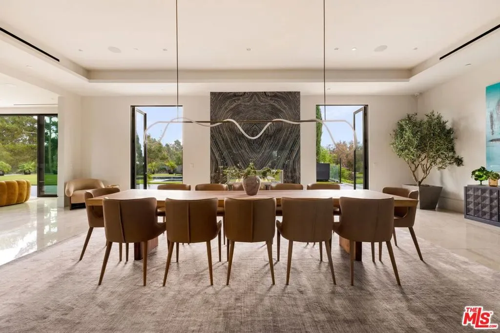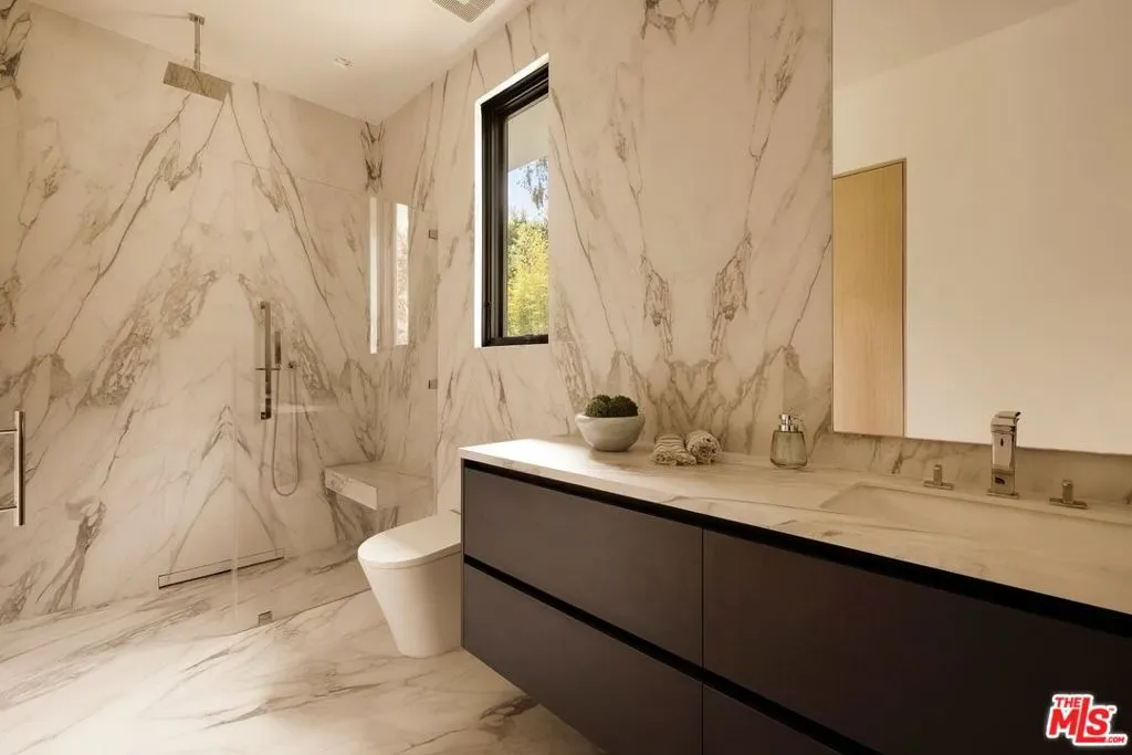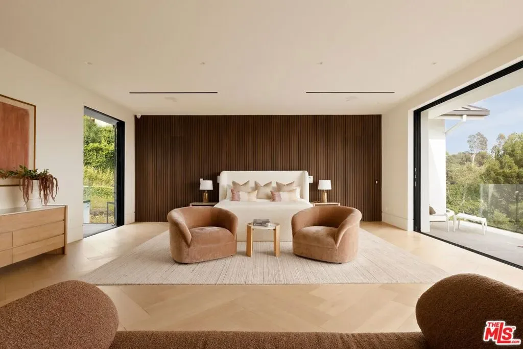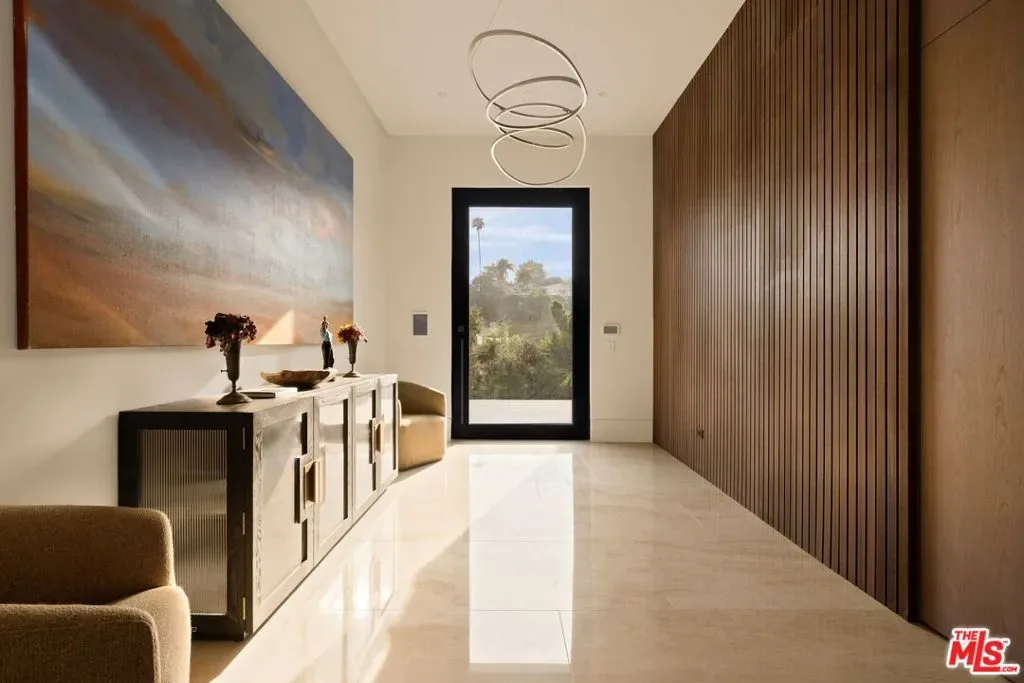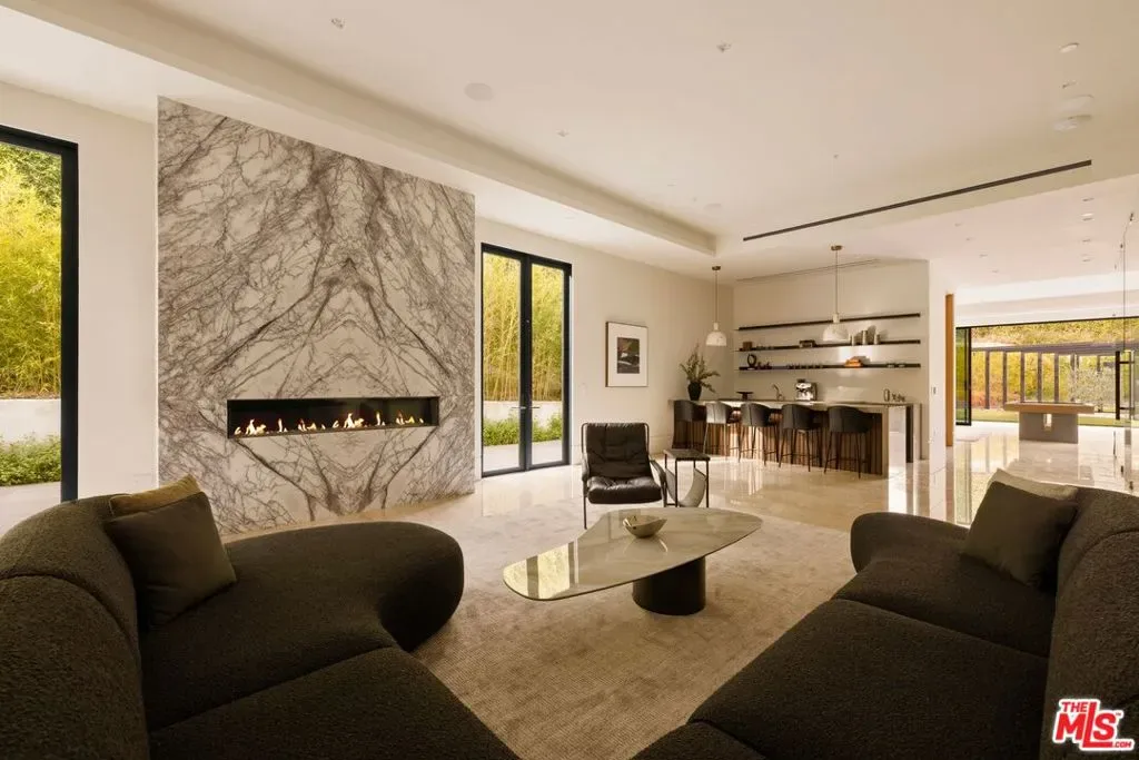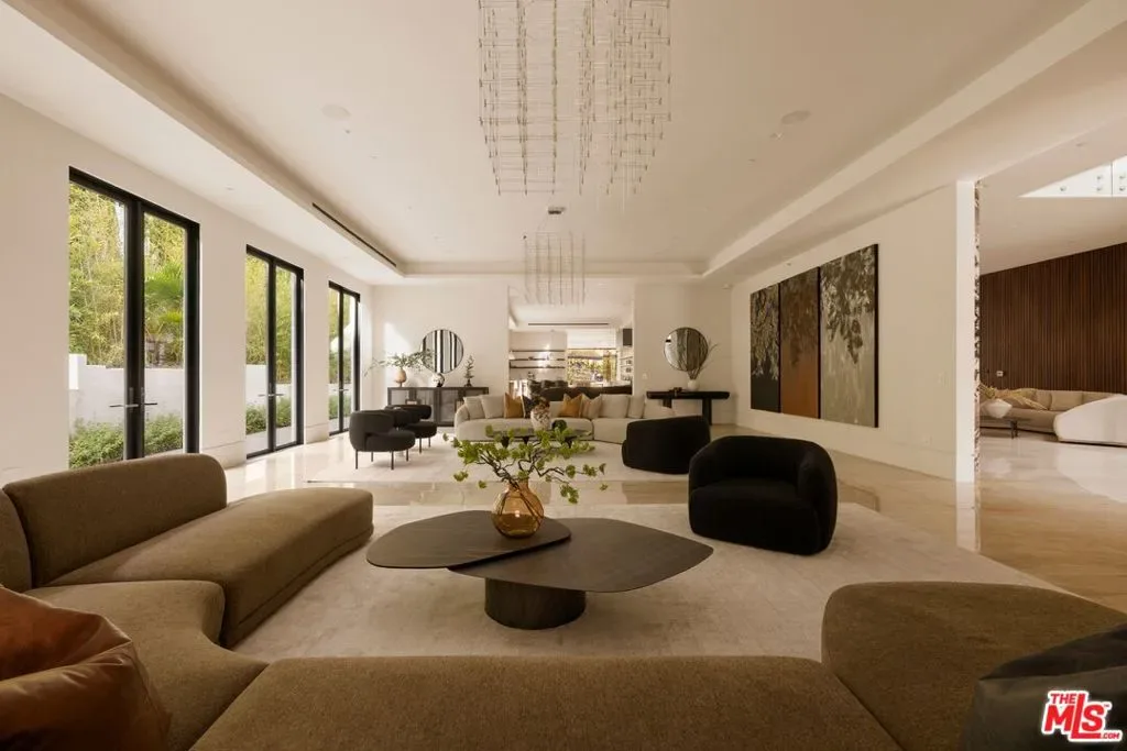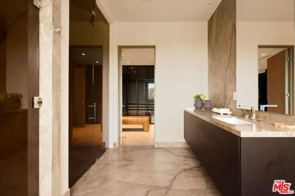 Commanding a private 2.5-acre setting within Crestwood Hills, this newly constructed estate is defined by its scale, architectural clarity, and uncompromising sense of privacy. Concealed behind gates and its own guard house, the property offers a level of seclusion rarely found in Brentwood. A striking double-height arrival sets the tone, where floating staircases, gallery-like volumes, and meticulously selected stone and wood finishes create a refined, modern palette. Light moves effortlessly through the interiors, illuminating expansive living spaces anchored by sculptural fireplaces and walls of glass that dissolve the boundary between indoors and out. The residence is designed with the intention of balancing grand entertaining with quiet retreat. Formal and informal living areas unfold seamlessly, complemented by a private office, a cinema-quality media room, and dining spaces that feel both intimate and architectural. At its center, a statement kitchen pairs bold materiality with precision, featuring Miele appliances and a substantial island designed for both function and presence. Nine en-suite bedrooms are thoughtfully distributed, culminating in a primary suite of significant scale, offering dual baths, expansive dressing rooms, and a private lounge environment. The grounds are equally considered with layered landscaping, open lawns, and curated outdoor spaces that frame a pool and sport court, creating a resort-like setting without sacrificing discretion. A separate 2-bedroom guest house oasis sits at the bottom of the property. A multiple-car garage and parking for 15+ vehicles completes the estate, accommodating a collection with ease. A property of rare composition where architecture, privacy, and scale converge in one of Brentwood’s most coveted hillside enclaves.