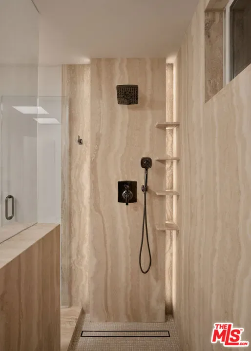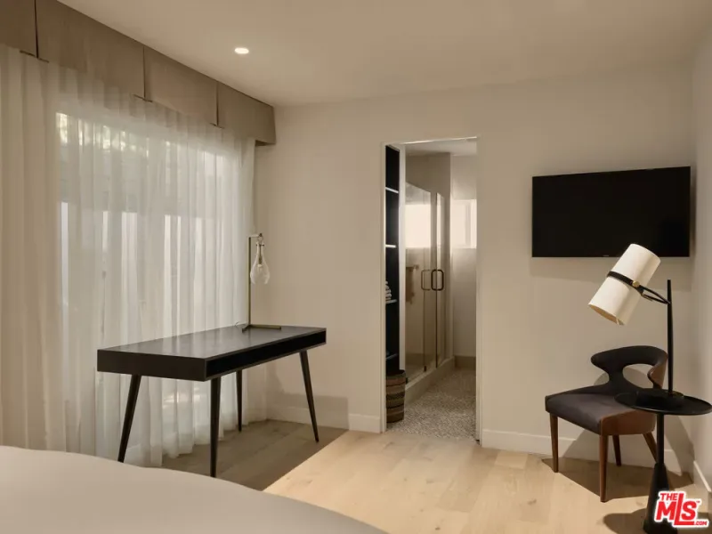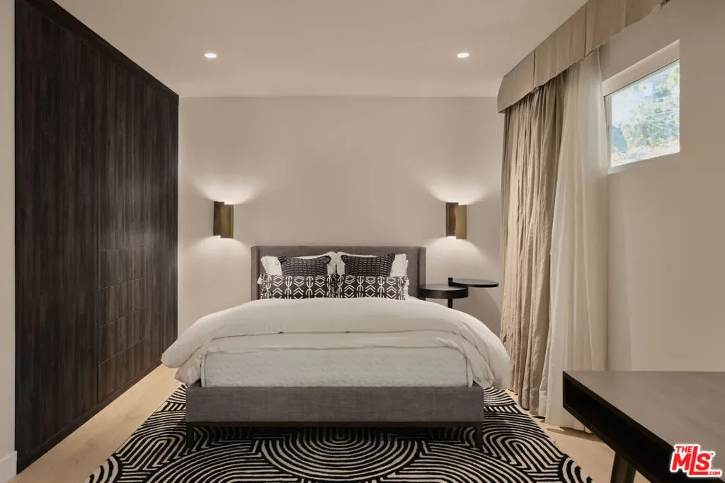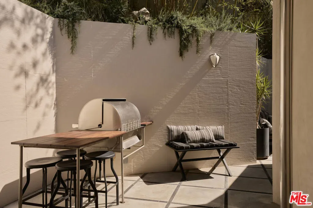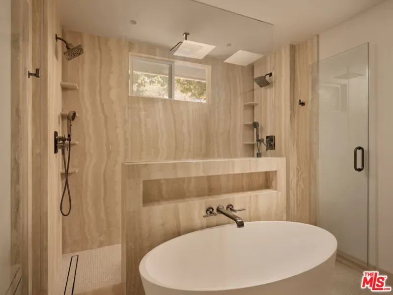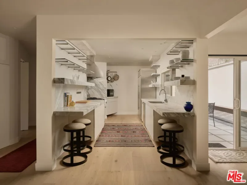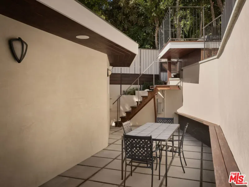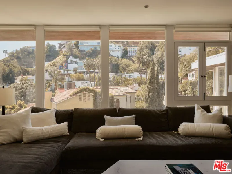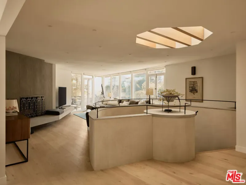 An impeccably restored Mid Century Modern with sweeping canyon views across the Hollywood Hills, where walls of glass and layered terraces frame a dramatic setting just moments from the Sunset Strip. Recently updated, the 3 bed, 4 bath home unfolds around a light-filled living room where floor-to-ceiling windows frame the surrounding canyon landscape and open directly to a private terrace. Overhead, a geometric skylight with wood slats filters natural light throughout the day, highlighting warm oak floors and the room’s softly curved interior forms. A linear fireplace runs along a vertically striated plaster wall and is paired with a sleek floating hearth that stretches the length of the room. The kitchen continues the home’s architectural language with clean lines, open shelving, marble countertops, and stainless steel appliances. A sculptural staircase rises through the center of the home, framed by a custom illuminated wood installation that spans both levels. The primary suite captures hillside and distant city views with space for a sitting area, while the primary bath is finished in vein-cut travertine with a freestanding soaking tub and walk-in shower. Expansive terraces extend the living areas outward, offering multiple vantage points of the city for dining, entertaining, or quiet evenings. Set above one of Los Angeles’ most iconic roads and moments from the energy of the Sunset Strip, 8593 Hollywood Blvd sits along a quiet street just minutes from restaurants, nightlife, and the best of LA.