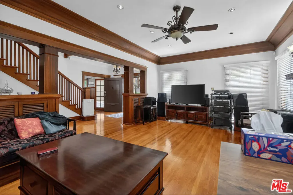 Located in the highly sought-after Hancock Park neighborhood, this classic 1914 Craftsman residence is a rare offering within the Historic Preservation Overlay Zone (HPOZ). The home features 4 bedrooms and 2.5 baths with a layout that feels both open and connected.Select photos include virtual staging to illustrate design possibilities and showcase the home’s full potential.Each bedroom offers direct access to one of two full-length balconiesfront and rearcreating a seamless extension of the living space and embracing Southern California’s indoor-outdoor lifestyle.The inviting front yard and expansive raised porch with elegant columns set the tone for the home’s timeless architectural appeal. Inside, light-filled living spaces feature hardwood floors, crown molding, two fireplaces, and distinctive staircases, all enhanced by abundant natural light.The kitchen offers granite countertops, travertine flooring, and French doors that open to a private redwood deck, creating an easy flow for everyday living and entertaining.The backyard is a peaceful retreat with mature fruit trees and multiple areas to relax or gather.With its classic architecture, generous layout, and enduring charm, this home presents an exceptional opportunity to update and personalize.