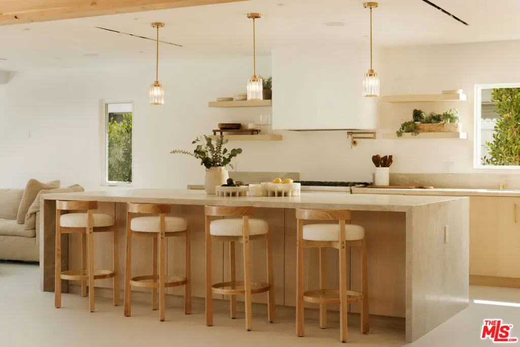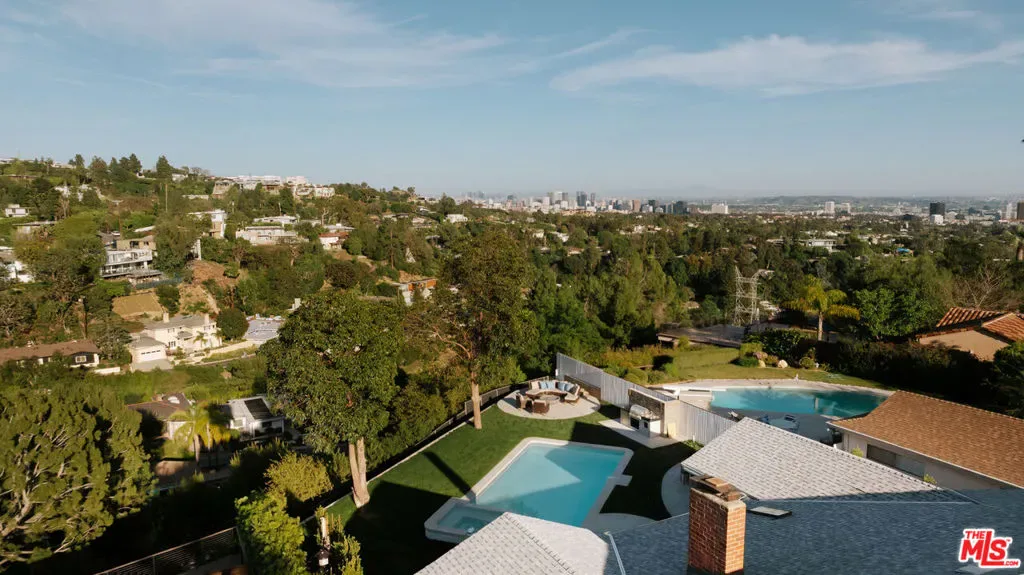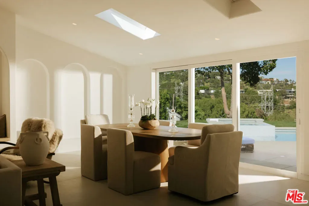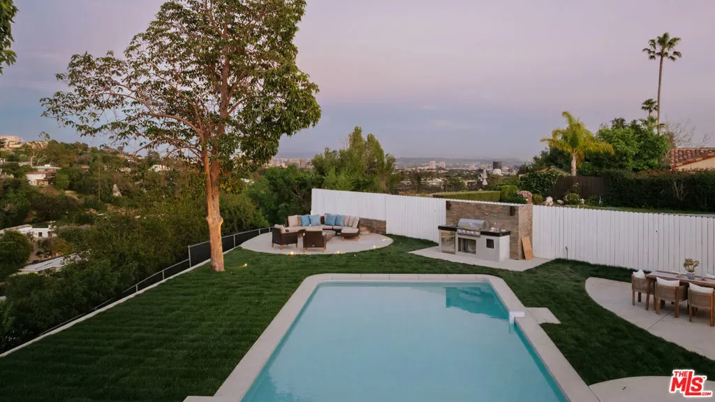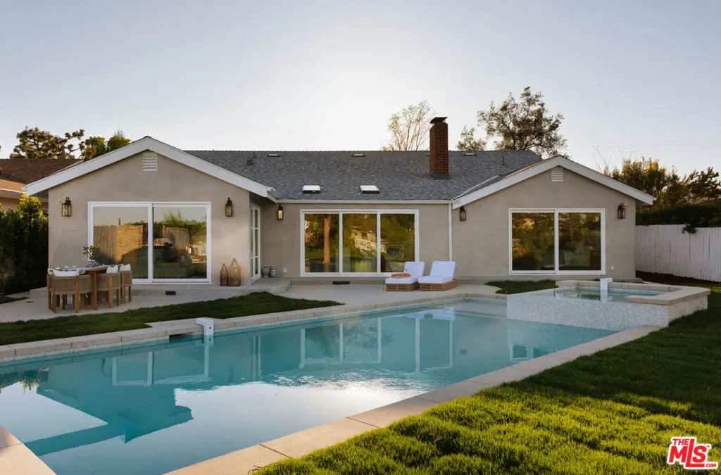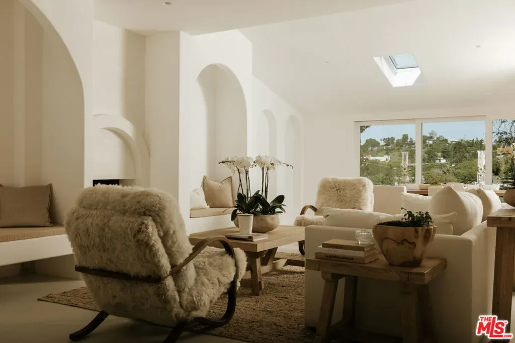 A striking expression of Organic Modern design with Contemporary Mediterranean influences, this fully reimagined single-story residence sits on a 14,013 sq ft lot capturing breathtaking canyon and city views. Spanning 2,757 square feet with 4 bedrooms and 4 bathrooms, the home was taken down to the studs and meticulously rebuilt, resulting in a designer showcase where every detail has been thoughtfully curated.An inviting open-concept floor plan unfolds beneath soaring ceilings accented by graceful architectural arches and skylights that bathe the interiors in natural light from morning through sunset. Walls of sliding glass doors dissolve the boundary between indoors and out, creating effortless flow ideal for both daily living and sophisticated entertaining.At the heart of the home, the chef’s kitchen makes a striking statement, featuring leathered stone waterfall countertops, an oversized gathering island, abundant cabinetry, a Thermador range with custom plaster hood, and elegant floating shelves. Oversized porcelain tile grounds the main living areas, while wide-plank hardwood floors add warmth to the private bedroom quarters.The outdoor spaces unfold as a private retreat designed for both relaxation and entertaining, complete with a welcoming porch framed by a grassy yard and artful landscape lighting, a sparkling pool and jacuzzi, outdoor kitchen, firepit lounge, and lush grassy areas in the front and backyardperfect settings for alfresco dining and sunset gatherings.Inside, gas fireplaces in the living room and primary suite finished with touches of Venetian plaster lend subtle vintage elegance. The primary suite offers expansive horizon views, generous closet space, and a breathtaking spa-inspired bathroom with a dramatic stone walk-in shower.The finished and insulated garage, with individual AC offers exceptional versatility and has been thoughtfully prepared to function as an extension of the living spaceideal for a gym, studio, office, or additional flex area.Additional features include a double-zone HVAC system, two AV charging stations, and a tranquil setting within the coveted Kenter Elementary School districtdelivering a sophisticated California lifestyle where design, comfort, and natural beauty converge.