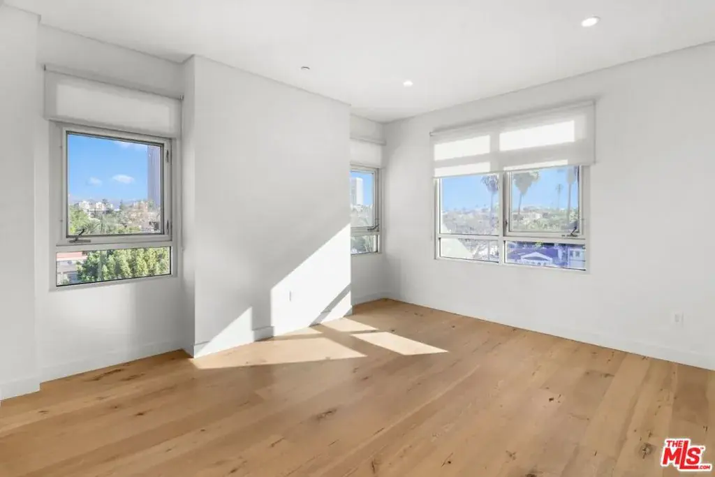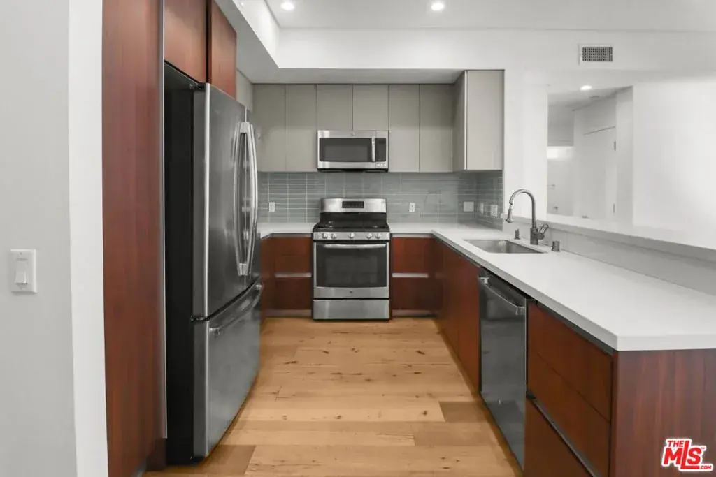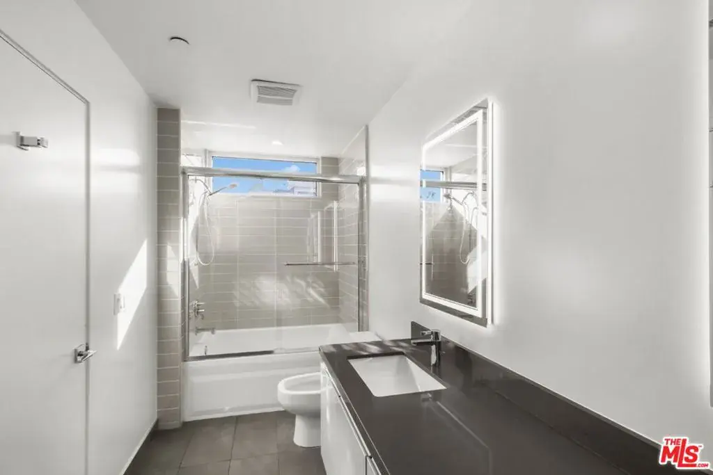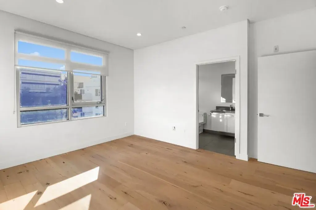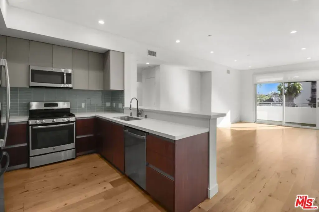 STUNNING CONTEMPORARY BUILDING ideally situated in Miracle Mile, centrally located near Beverly Hills, Downtown LA and the Santa Monica Beach. This beautifully designed unit with its open floor plan, high ceilings, recessed lighting, natural oak wood floors, dual pane windows, central heat & air conditioning, walk in closet in master bedroom and tandem 2 car parking has European styled kitchen cabinets, quartz countertops, soft touch closing cabinetry, stainless steel appliances including washer and dryer. Unit is on the top floor with views of the Hollywood sign & SM Mountains, balcony off living room facing east. The exquisite bathrooms have subway tiles,quartz countertops, deep tubs and tile floors. No detail overlooked. Building is near Farmers Market, Petersen Museum and the Grove.