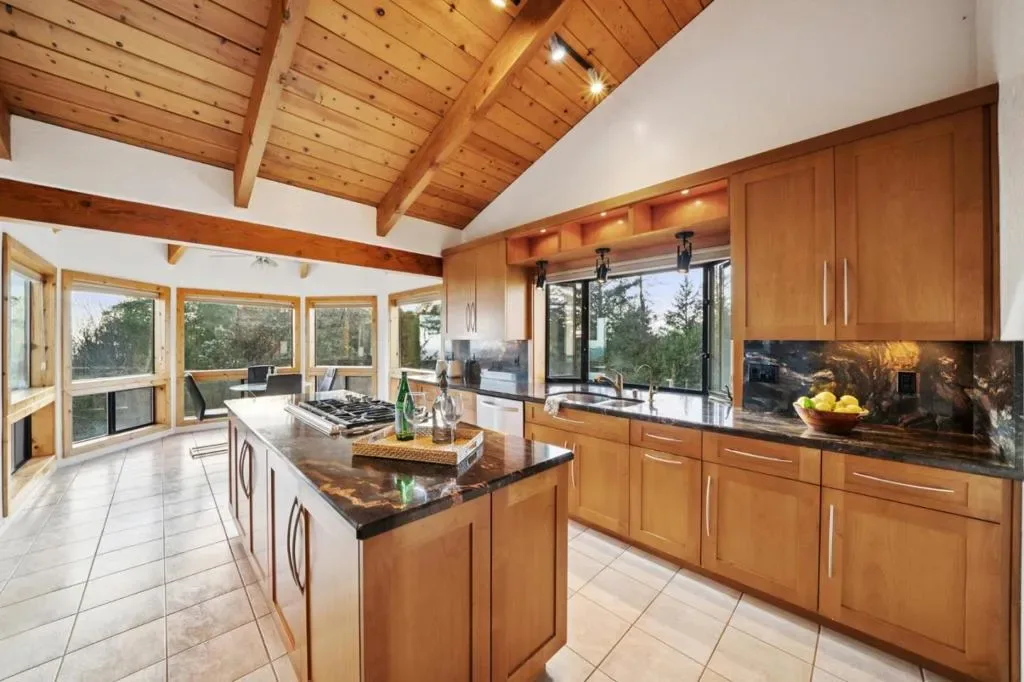 “Ridge Top” estate on 13 acres with breathtaking ocean, mountain & vineyard views! Tri-level Mediterranean-style home built in 1992. Spacious formal entry with vaulted ceilings. Steps up to living/dining room w/fireplace, vaulted wood ceilings, sliders to deck. Remodeled kitchen with cherry cabinets, granite countertops, stainless appliances. Pool view from kitchen window. Bright breakfast bay with floor-to-ceiling windows, spectacular 180 views. New hardwood flooring, bathrooms remodeled in ’24. Two large primary suites, new custom plantation shutters. Primary bathroom features a luxurious deep, free-standing soaking tub under window, oversized shower, dual vanity. Steps down to guest suite with huge walk-in closet. Lower level family/rec room with wet bar, sitting area, spacious office bay. 3rd bedroom with fireplace, sliders to deck, adjacent hall bath. Lwr level layout designed for potential 4th bedroom. Lap pool w/spa, sunny travertine deck. Usable land offers space for vineyard, gardening, sport court or horses. Long circular driveway, generous parking, room for oversized vehicle/ RV. 4 car drive-thru garage, vaulted wood ceilings, potential to convert to ADU? Comcast internet, excellent shared well. Central location near Summit store & schools, easy drive to town or beach!