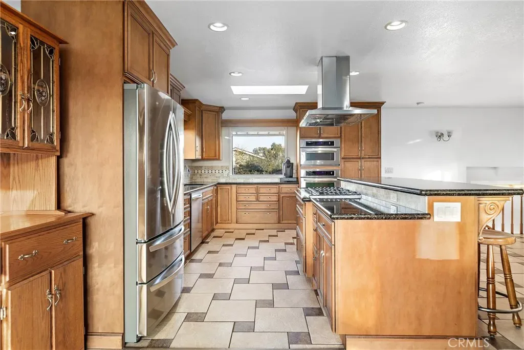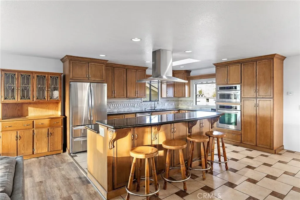 The kitchen, open to the main living area, features a large center island with stainless steel overhead hood vent, granite counters, new soft-close cabinetry, ample storage, and a new tile floor, making it both stylish and functional.