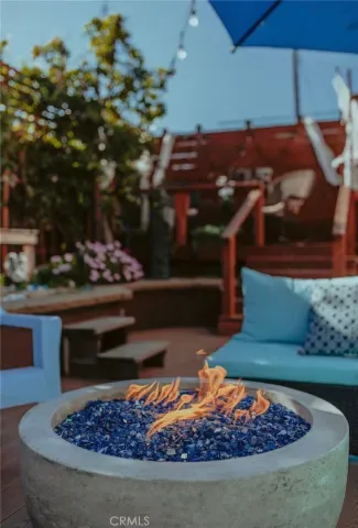 Outdoor living features include a thoughtfully designed backyard space with a gas fire pit, outdoor soaking tub, and areas for relaxation and entertaining. From the upper front bedroom, there is a peek of the ocean.