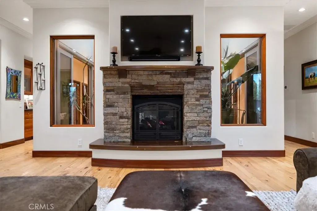 Upstairs, a bonus space with wrap-around windows, skylights, barn wood ceiling, stone fireplace, and full bath provides flexible use as a guest suite, media room, or studio. Additional features include 44 owned solar panels, two Tesla wall batteries, Tesla EV charging, a whole-house LifeSource water filtration system, and a new 50-gallon high-efficiency water heater.