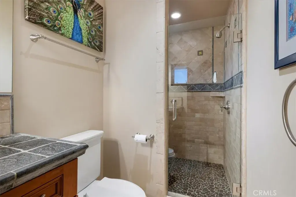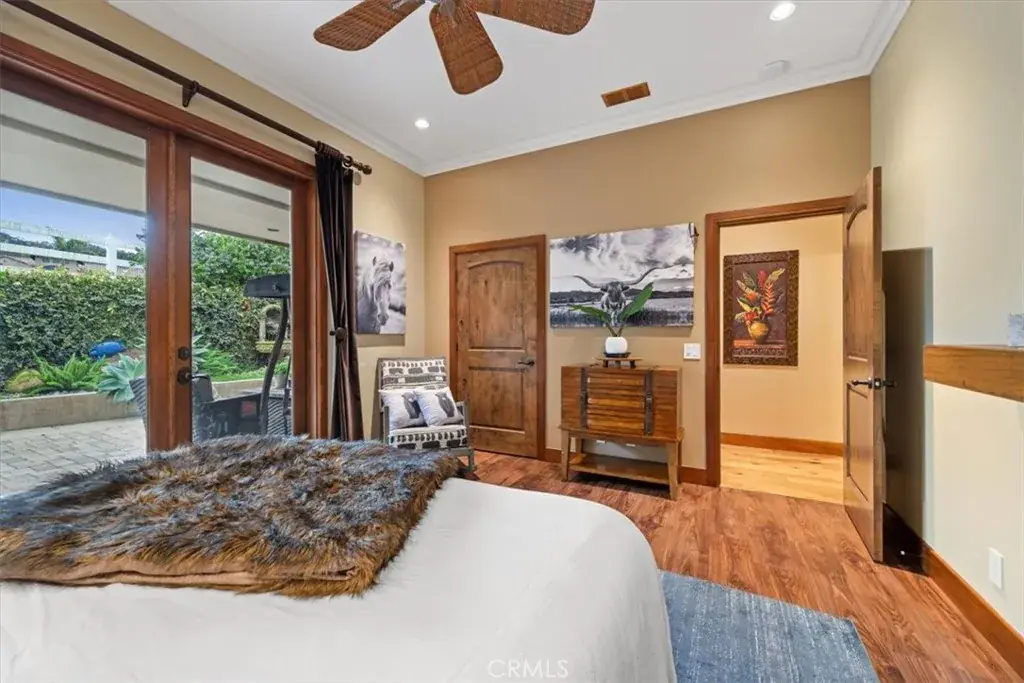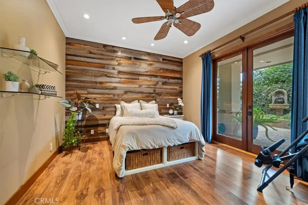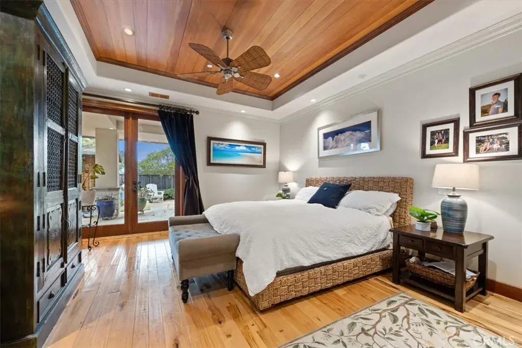 The main level includes a private office and three bedrooms. The office is exceptionally light-filled, framed by French doors and windows that open directly outdoors, creating an ideal work-from-home or creative space. The primary suite offers a fireplace, French doors to a tropical outdoor setting, dual oversized custom closets, and a spa-inspired bath with travertine floors and a custom steam shower. Two additional main-level bedrooms feature French doors with private outdoor access, creating a seamless indoor-outdoor flow.