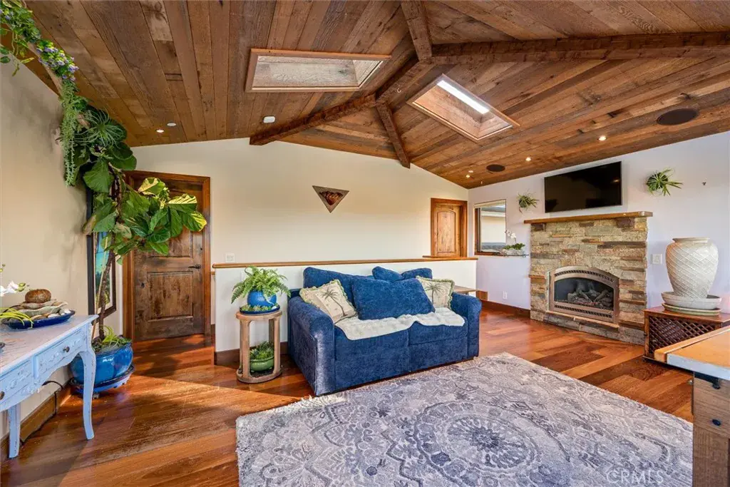 Inside, soaring ceilings and abundant natural light highlight wide plank hickory wood flooring, skylights, crown molding, and custom Windsor windows with handcrafted casings. Hand-poured concrete fireplaces with embedded seaglass tile anchor the living spaces, while a central atrium with natural plantings and operable upper windows brings in ocean air.