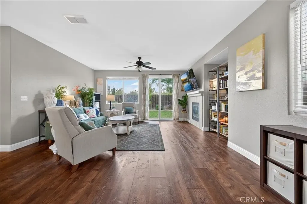 Multiple living spaces including formal living/dining + family room with fireplace