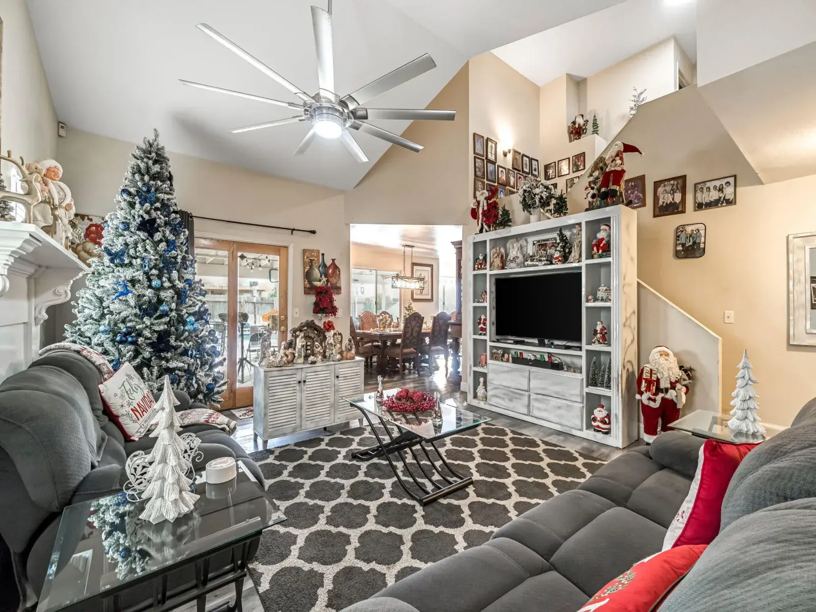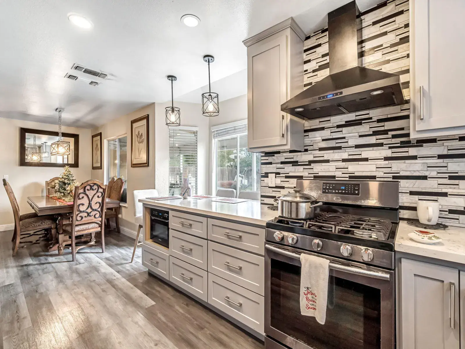 Step inside and experience the inviting living room with vaulted ceilings, a cozy fireplace, and abundant natural light, creating a warm and spacious atmosphere. The modern kitchen is a chef’s dream, featuring stone countertops, shaker-style cabinets, a designer backsplash, a wall-mounted chimney hood, and a large breakfast bar and peninsula—ideal for entertaining or family gatherings.