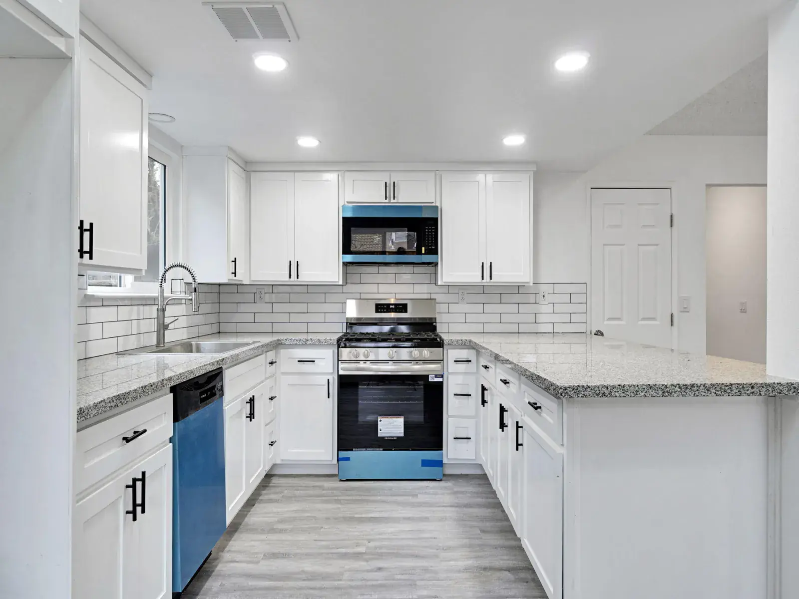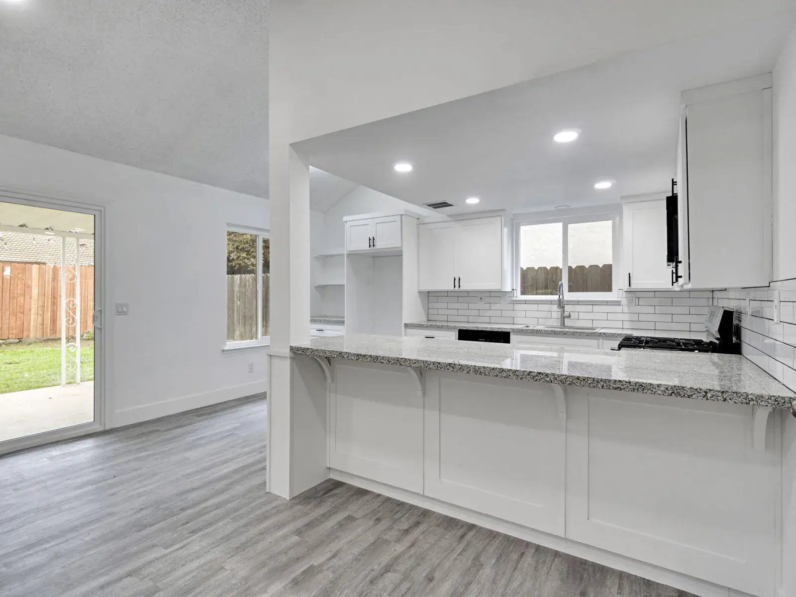 The kitchen is both functional and stylish, featuring a kitchen bar and peninsula that provide ample space for meal preparation and casual dining. Stone countertops, shaker cabinetry, a built-in stovetop, and a designer backsplash add both elegance and practicality.