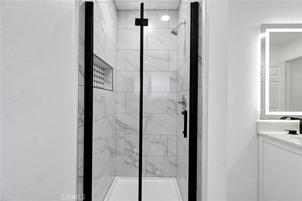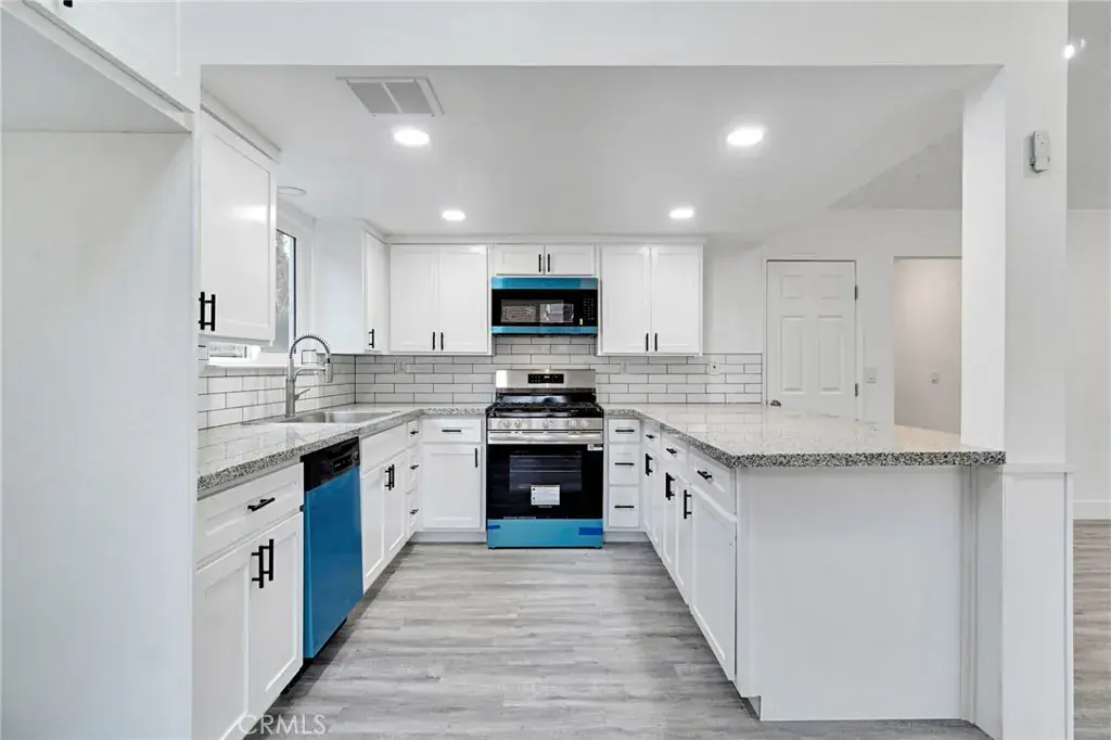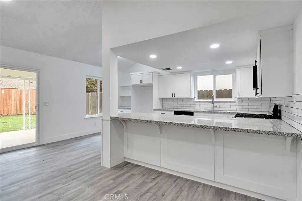 The kitchen is both functional and stylish, featuring a kitchen bar and peninsula that provide ample space for meal preparation and casual dining. Stone countertops, shaker cabinetry, a built-in stovetop, and a designer backsplash add both elegance and practicality.