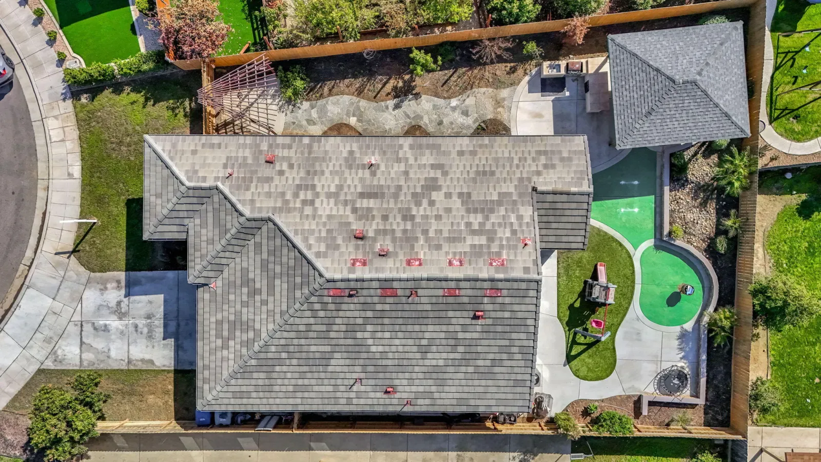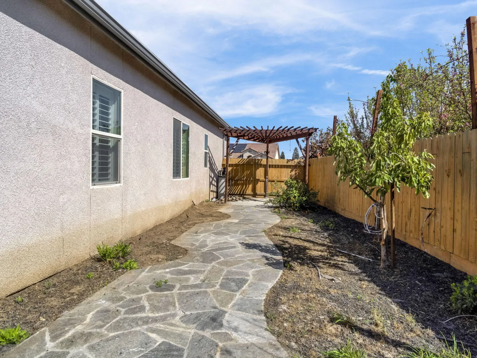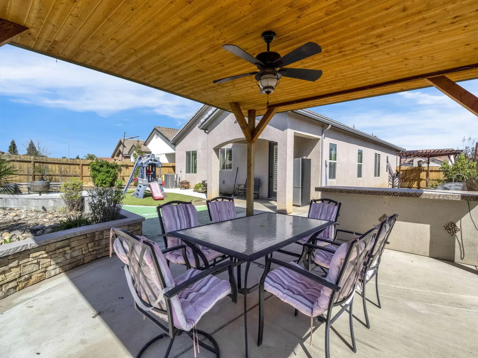 Located at 294 Double Tree Court in Madera, this well-maintained single-story home offers 3 bedrooms, 2 bathrooms, and a functional layout situated on a cul-de-sac lot in the Lions Town & Country Park area. The home features an open floor plan connecting the living room and kitchen. The living area includes tray ceilings and crown molding, adding architectural detail to the main living space. The kitchen is equipped with granite countertops, shaker-style cabinetry, stainless steel appliances, tile backsplash, breakfast bar seating, and a peninsula, along with a pantry for additional storage. The primary bedroom is positioned separately from the other bedrooms and includes a walk-in closet and private bathroom with double vanity. Two additional bedrooms and a full bathroom are located near the front of the home. Additional interior features include a dedicated laundry room and a tiled roof. The backyard offers multiple outdoor living areas, including patio spaces, a large gazebo/pergola with electrical hookups and ceiling fans, and an outdoor kitchen with built-in BBQ. The landscaped yard provides flexible space for outdoor use. The garage includes epoxy flooring, a built-in workbench, and a utility sink. Located near Lions Town & Country Park, shopping, dining, and local amenities, this property combines interior comfort with versatile outdoor features. Buyer to verify all information to their satisfaction.