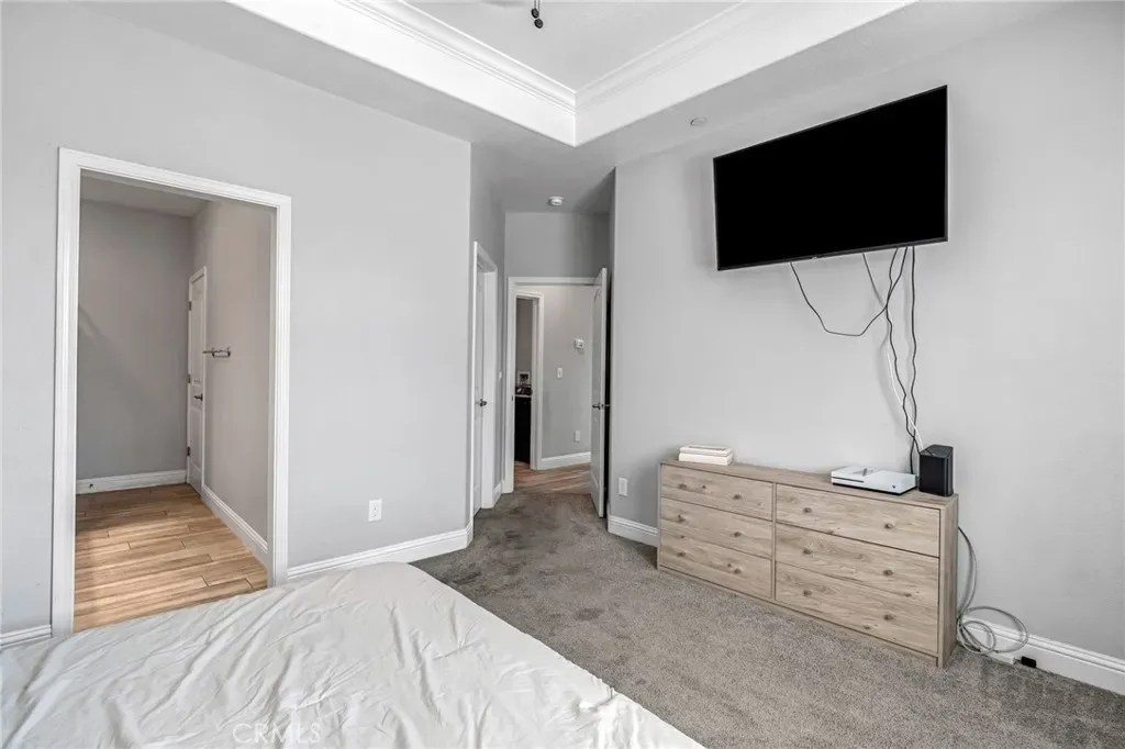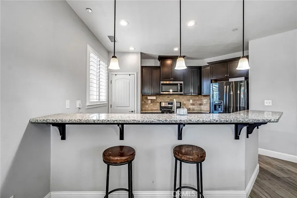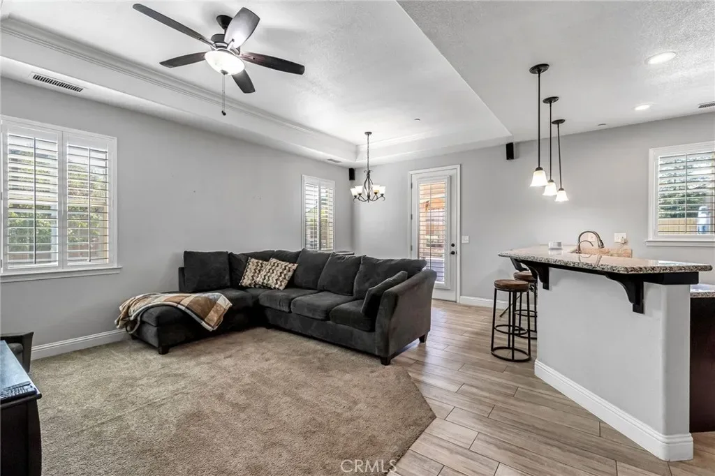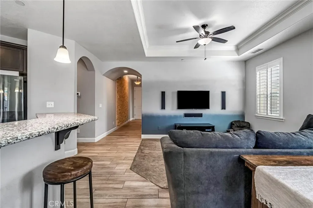 The home features an open floor plan connecting the living room and kitchen. The living area includes tray ceilings and crown molding, adding architectural detail to the main living space. The kitchen is equipped with granite countertops, shaker-style cabinetry, stainless steel appliances, tile backsplash, breakfast bar seating, and a peninsula, along with a pantry for additional storage.