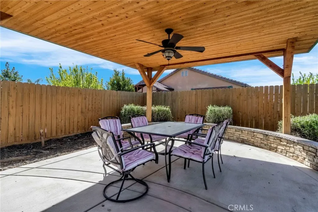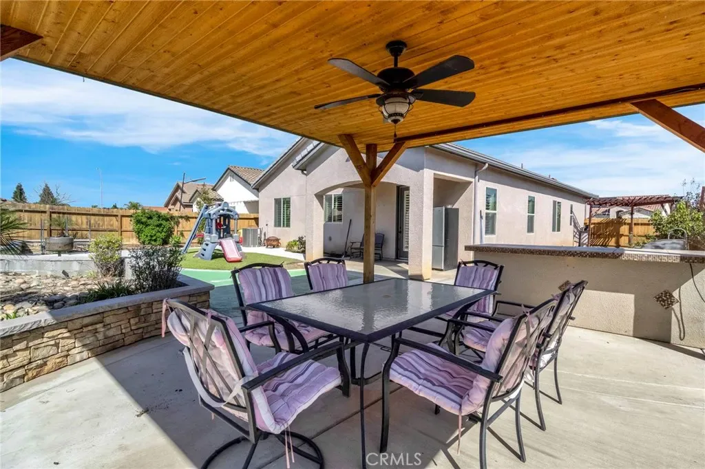 The backyard offers multiple outdoor living areas, including patio spaces, a large gazebo/pergola with electrical hookups and ceiling fans, and an outdoor kitchen with built-in BBQ. The landscaped yard provides flexible space for outdoor use.