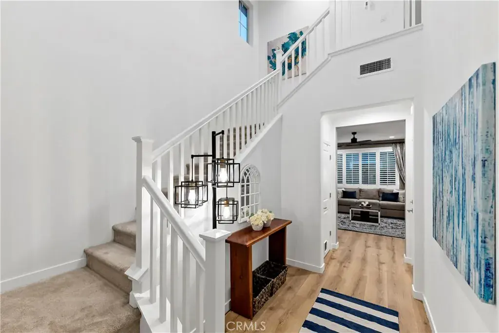 Upstairs features fully upgraded carpet throughout and a spacious primary suite with a redesigned custom closet, accent wall, and blackout window covering for added privacy. Plantation shutters, a tankless water heater, EV charger setup, and garage ceiling storage add everyday functionality.