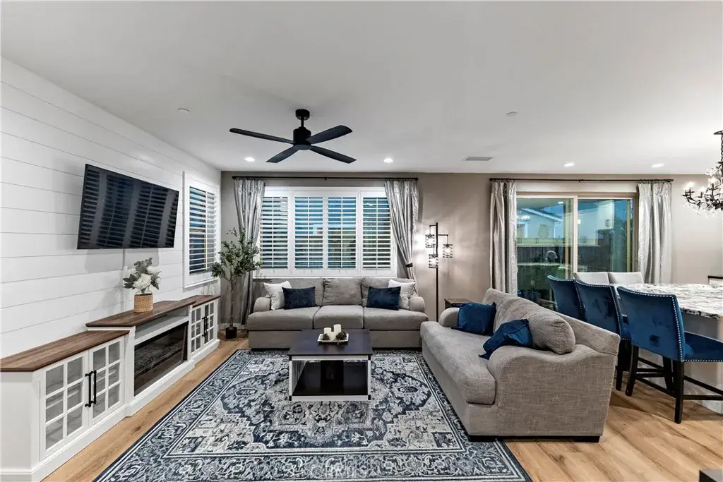 As you walk in, you’re welcomed into a cozy living room featuring a shiplap accent wall and durable scratch-resistant laminate flooring. The space flows seamlessly into the kitchen, where an extended countertop island, black soapstone countertops, black backsplash, a double oven, and smart app-connected appliances create a sleek and functional gathering space. From the kitchen, the extra-long sliding door brings in natural light and opens directly to the backyard.