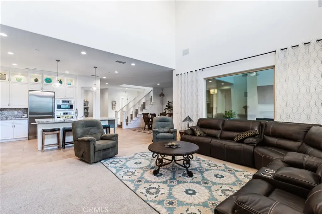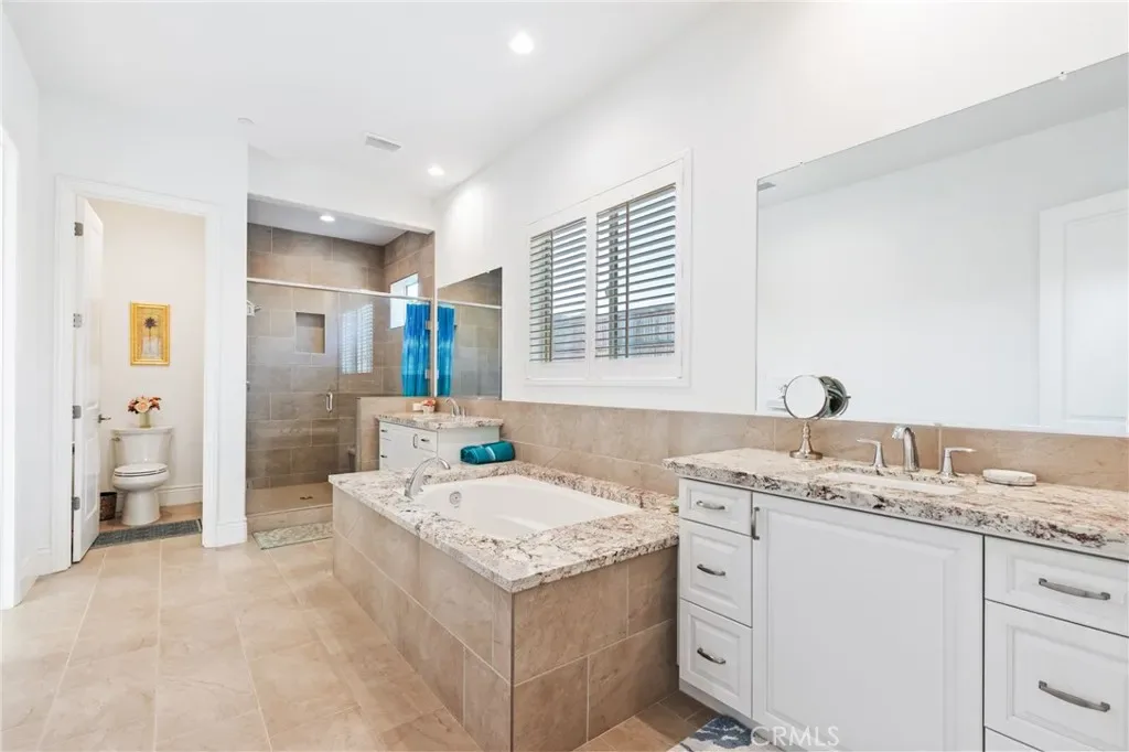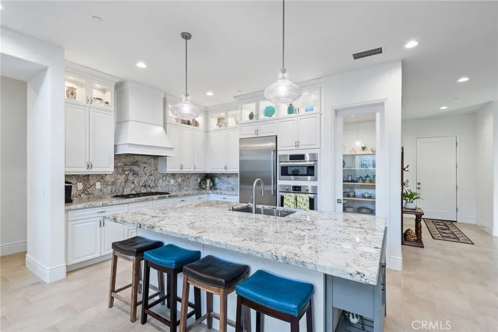 high-end built-in refrigerator, glass-front cabinetry and a walk-in pantry. The primary suite features backyard access, spa-like bath