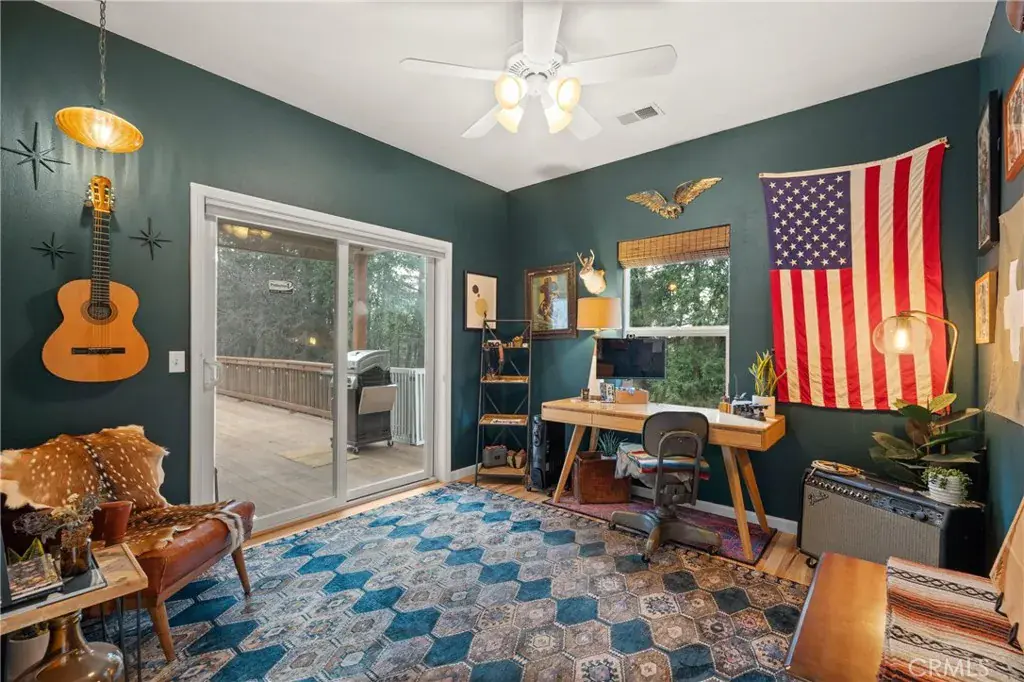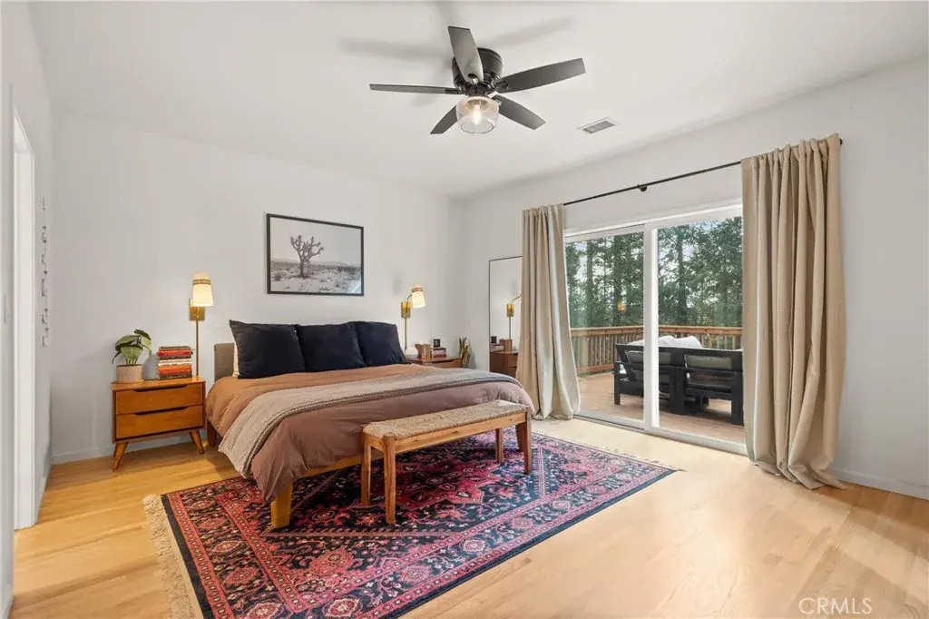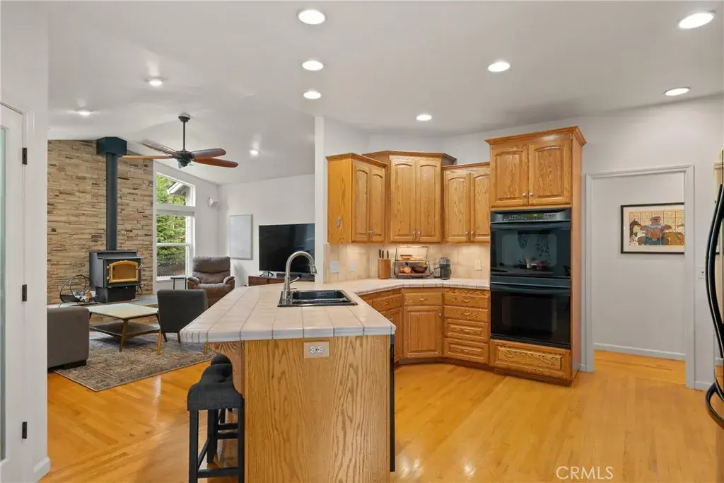The kitchen includes tile countertops, double ovens, pantry storage, and bar seating ideal for entertaining. The spacious primary suite is a true retreat with private deck access, a large walk-in closet, and an ensuite bathroom featuring dual sinks, a step-in shower, and a soaking tub. Two guest bedrooms and a guest bathroom are located on the opposite end of the home for added privacy.