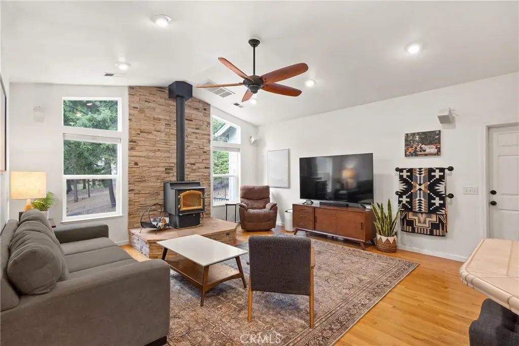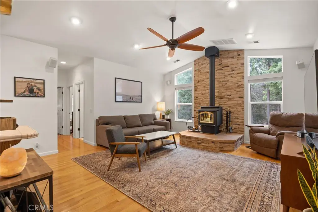 Inside, over 2,200 square feet of well laid out living space features a desirable split floor plan with a formal living room as well as an additional living room. The living room showcases a custom rock hearth and a wood-burning stove with heat transfer system. The formal dining room, currently used as an office, adds versatility, while the informal dining area off the kitchen offers everyday convenience.
