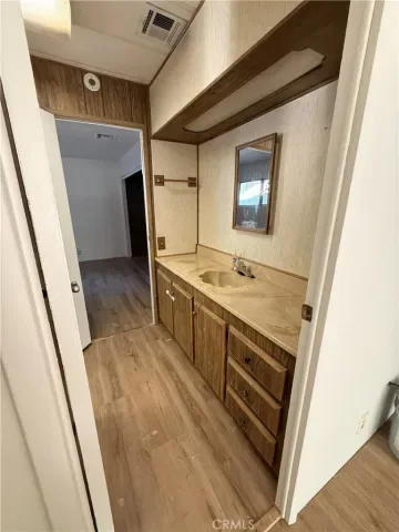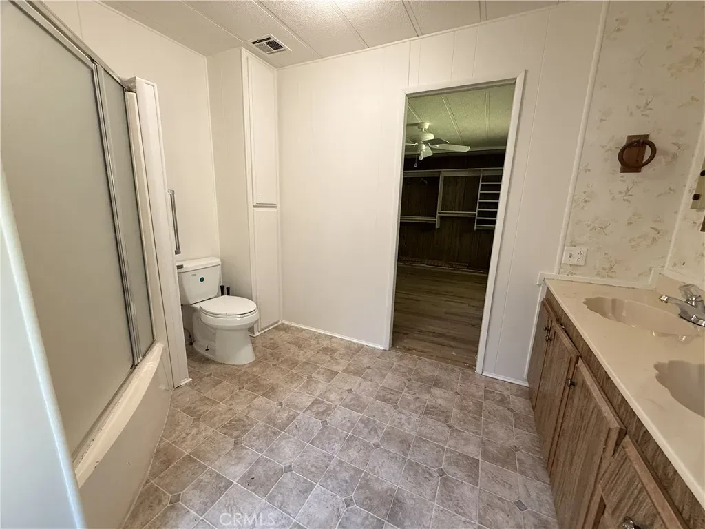 The master suite features a large closet and a private bath with dual sinks and a corner tub/shower unit. The guest room also offers private access to the second bathroom, which includes a spacious walk-in shower.
