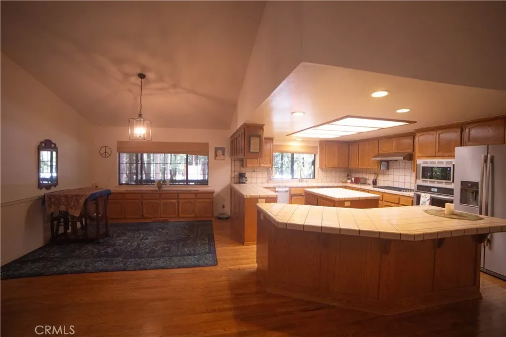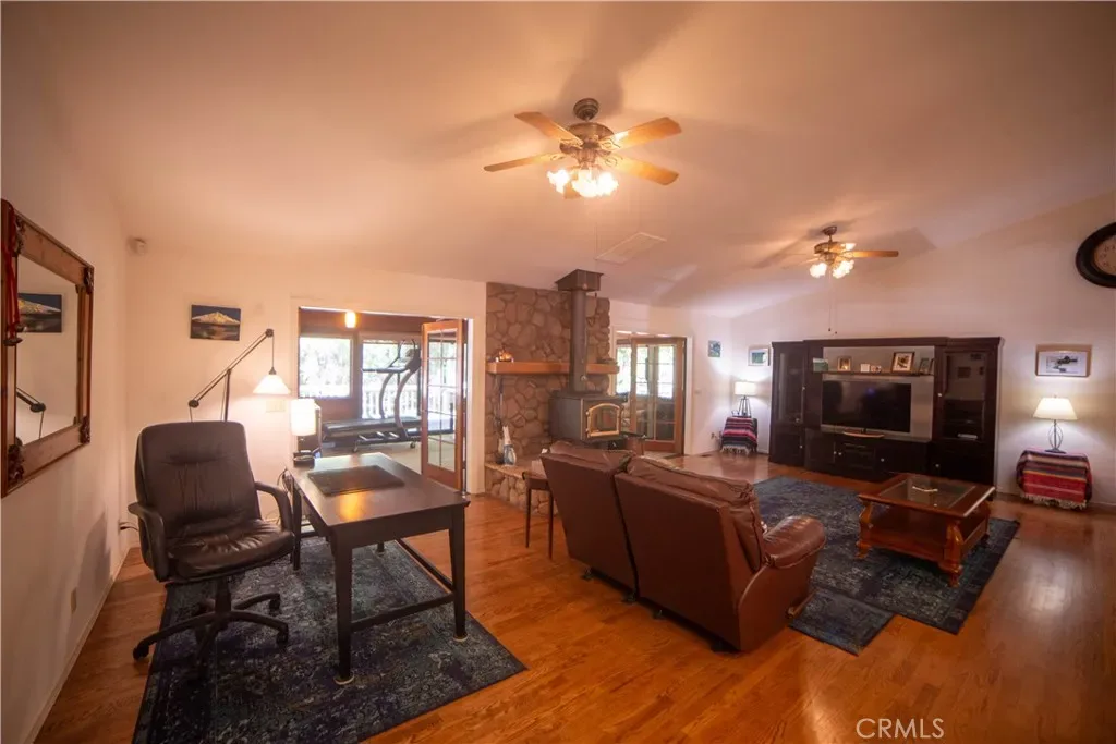 Situated on a fully fenced, sprawling 5.5 acres, the home is perfectly nestled among mature trees, offering unmatched privacy and a natural buffer from neighboring properties. Inside, you’ll find hardwood floors, new carpet, and an expansive living room with soaring ceilings and a cozy wood-burning stove ideal for cool mountain evenings.