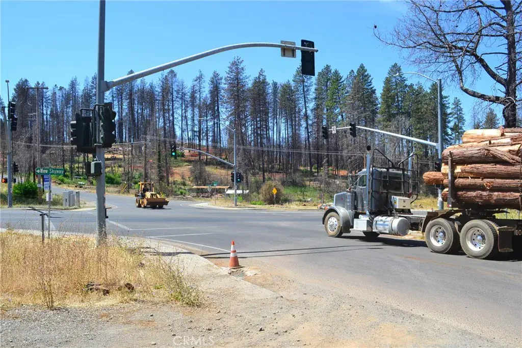 Strategically positioned at a highly traveled, signalized four-way intersection, the parcel boasts exceptional visibility with frontage on three sides and two corners, creating outstanding exposure for a future commercial, mixed-use, or destination concept. The site features a large, level building area where the former structure stood, along with additional space on the canyon side of Skyway that may offer the potential for a residential component (buyer to verify).