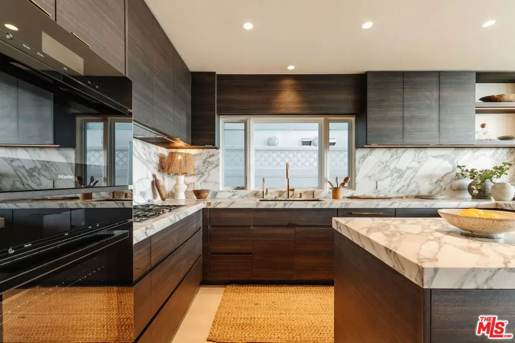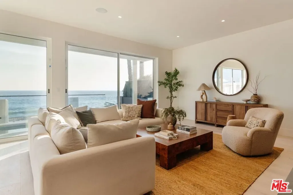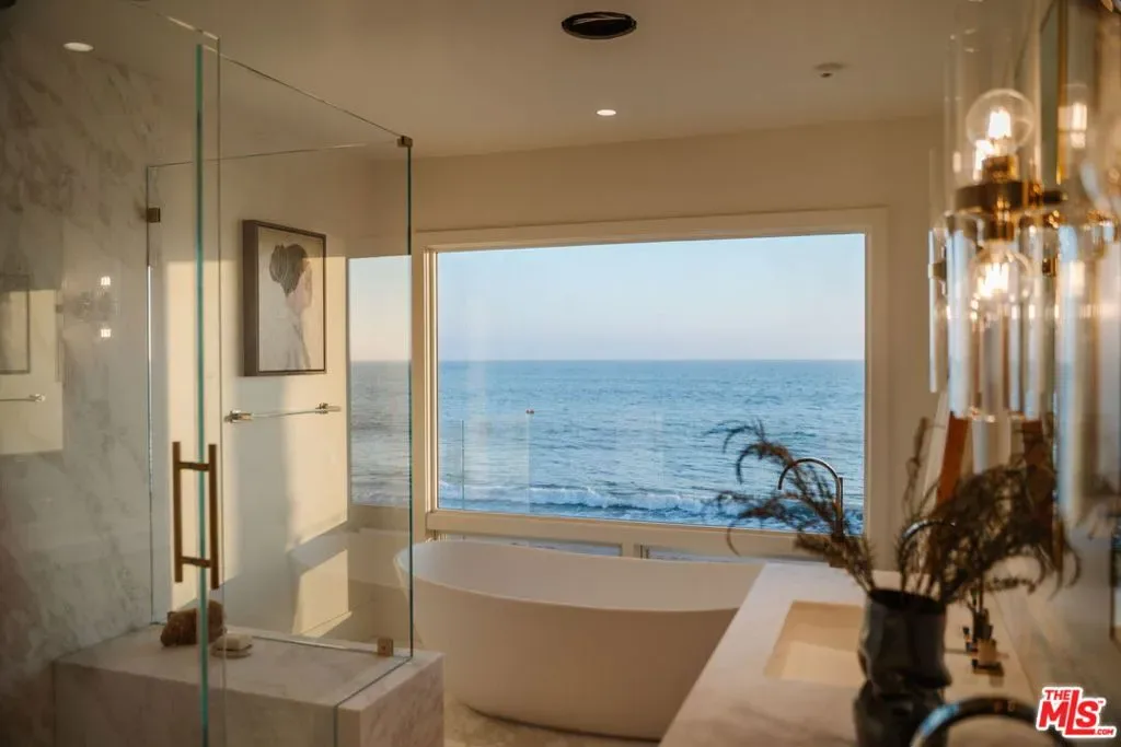 A newly renovated ocean front home located on the most coveted sandy stretch of Malibu, Carbon Beach. Masterfully renovated down to the studs, 22440 Pacific Coast Highway spans 5-BR, 4-BA, and 3,200-SF, featuring oak wood floors, natural stone finishes, and a neutral palette that invites grounded luxury. Walls of glass frame breathtaking ocean views, infusing interiors with light and restorative calm. With 9′ ceilings, clean lines, and finishes chosen for both beauty and longevity, the home delivers effortless beachfront living. The kitchen, outfitted with Miele appliances, Calacatta Vagli countertops, and a waterfall island, is an organic-luxe centerpiece designed for wellness-driven living. Upstairs, the primary suite offers vaulted ceilings, an oceanfront terrace, a walk-in closet, and a spa-inspired soaking tub with Calacatta stone accents. Outdoors, the pool deck and seamless indoor-outdoor flow create a serene, sun-drenched retreat. Moments from Nobu, Malibu Pier, and local shops, this move-in-ready sanctuary embodies elevated, modern beach living on Carbon Beach.