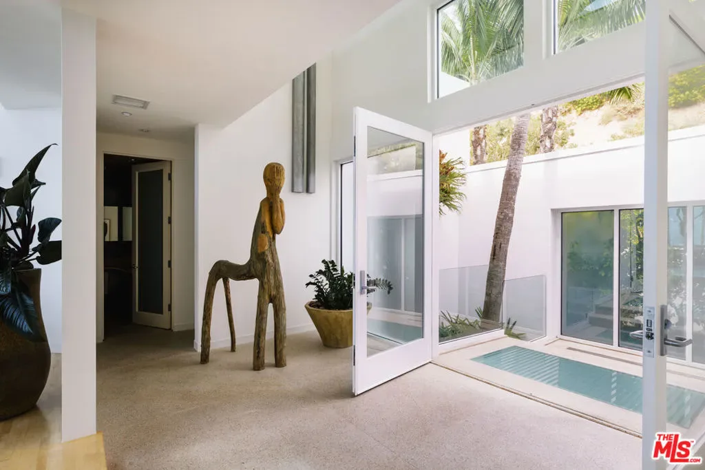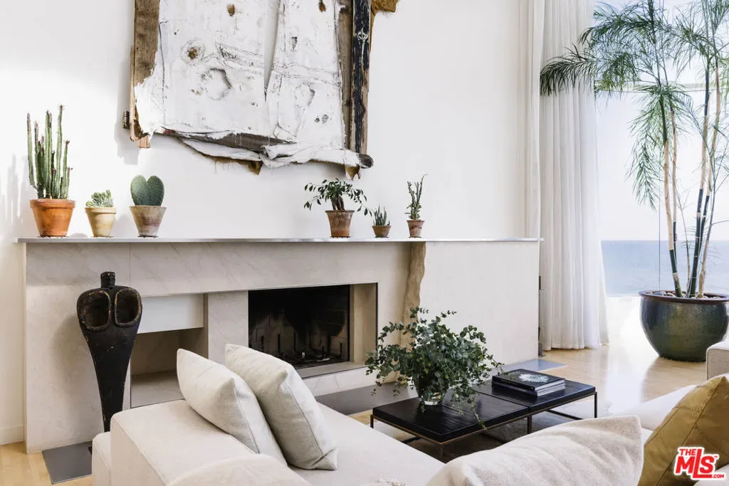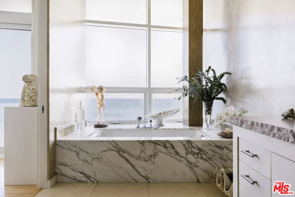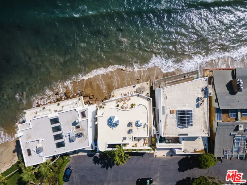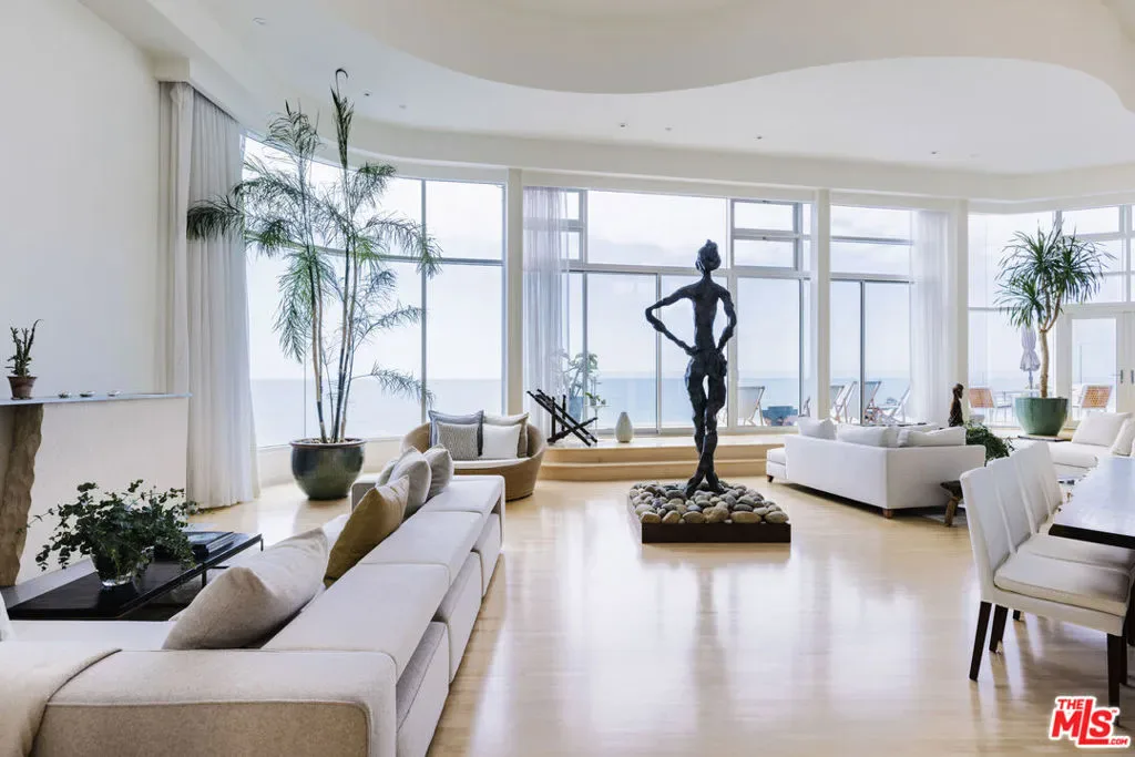 A visionary architectural statement along the sands of Malibu Cove Colony, this sculptural beachfront residence exemplifies the harmony between form, light, and the Pacific horizon. Conceived as both a work of art and a livable sanctuary, the home is enveloped in walls of glass and sweeping organic curves, where each line is drawn toward the sea. With 60 feet of ocean frontage, multiple terraces, and panoramic vistas stretching from Point Dume to Palos Verdes, every room becomes a front row seat to nature’s performance. Inside, soaring ceilings and skylights pour daylight across fluid, gallery like interiors that blend contemporary sophistication with a serene coastal palette. The main living area unfolds seamlessly with living, dining, and kitchen spaces unified by transparency and light. A sleek fireplace anchors the space, while the kitchen’s stainless steel appliances, bar seating, and built in banquette evoke both utility and style. Step through glass doors to the full width oceanfront balcony, a stage for golden sunsets and intimate al fresco dinners. Above, a tranquil loft office and sitting area opens to an expansive deck, with exterior stairs ascending to a private rooftop retreat, perfect for sunbathing or quiet reflection. Below, three serene bedrooms, each with ensuite baths, offer restful privacy. The primary suite, a masterful composition of texture and tone, features a sitting area with fireplace, a spa inspired marble and limestone bath with a soaking tub poised before the sea, and a private terrace that frames the coastline in cinematic splendor. Set at the end of a prestigious guard gated enclave, this Malibu Cove Colony residence is more than a home; it is a modern sculpture in glass and light, celebrating the seamless dialogue between architecture and ocean.