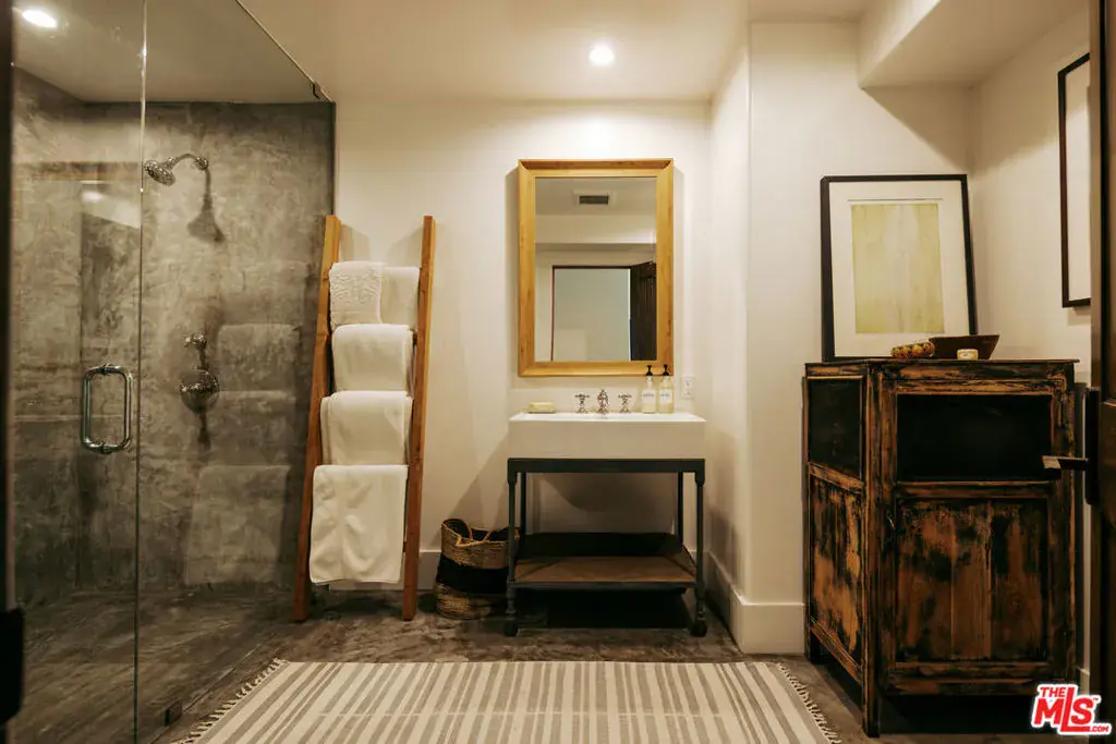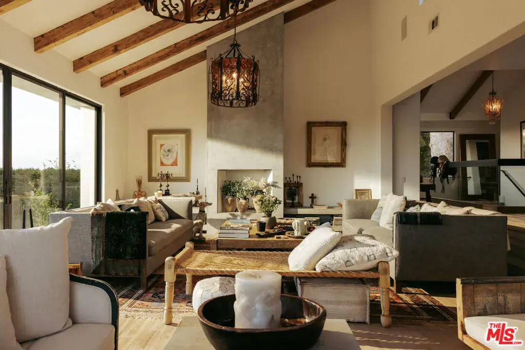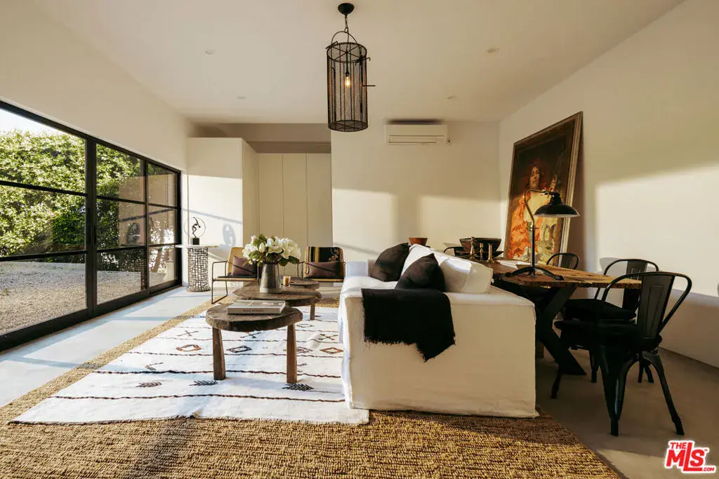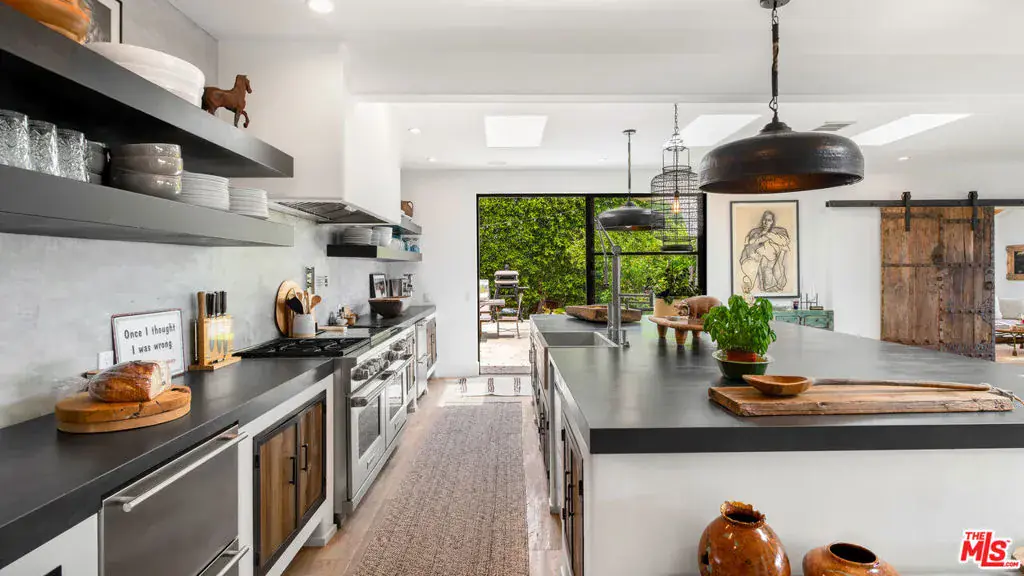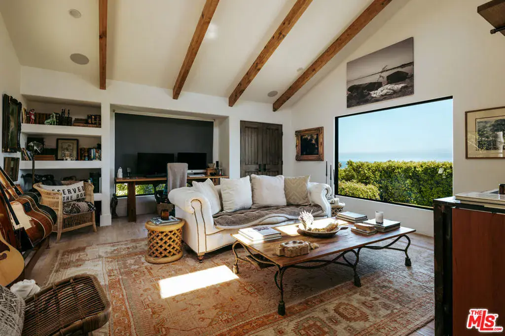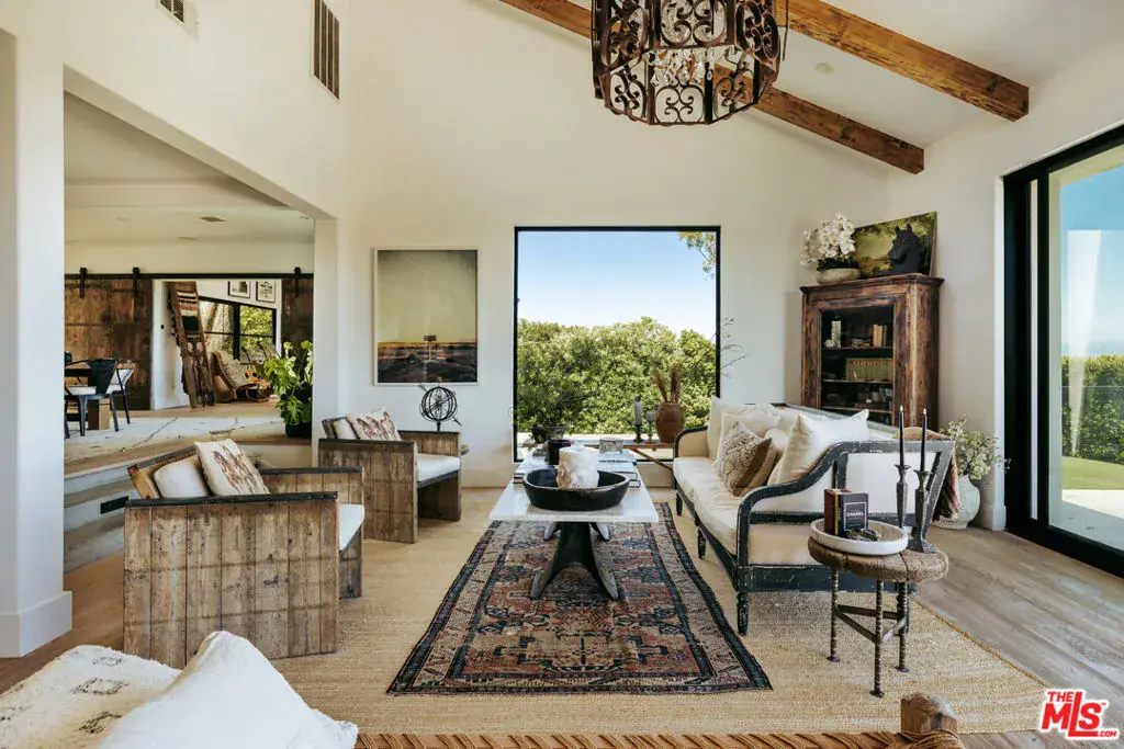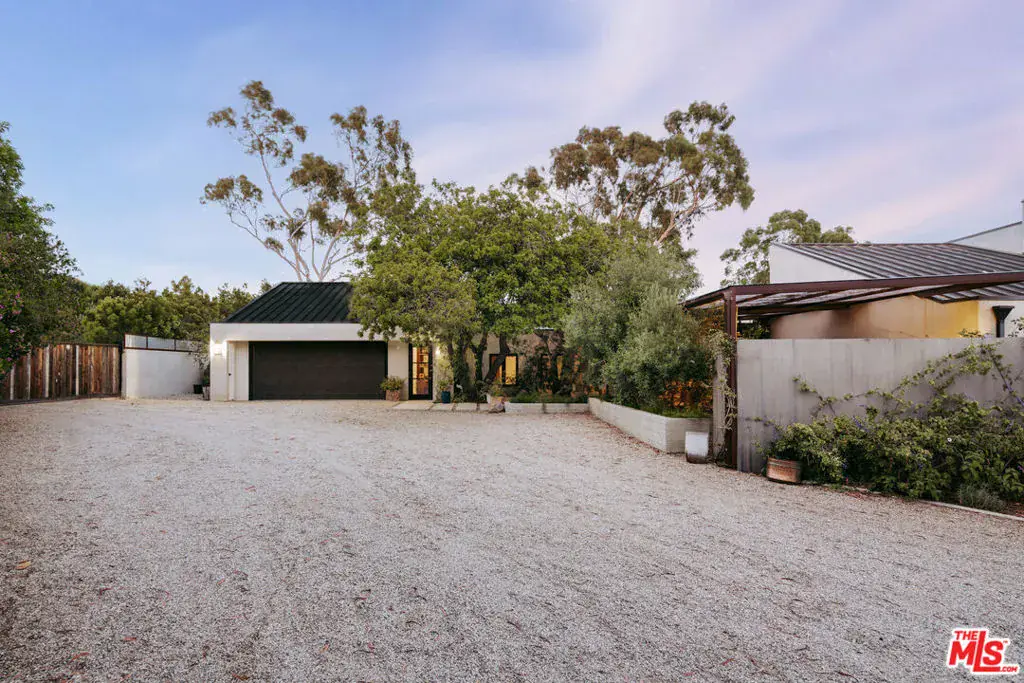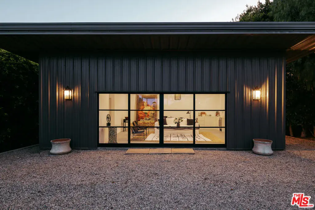 Tucked behind mature hedging on one of Malibu’s most desirable streets, this exquisite estate presents a striking blend of California modernism and rustic refinement. Completely reimagined with an emphasis on natural light, flow, and function, the property exudes a sense of serenity from the moment you arrive. Anchored by clean lines and framed by mature trees, the residence features a contemporary stucco exterior with sharp geometric rooflines and walls of glass that open to expansive grounds. Inside, the interiors unfold with organic warmth where wide-plank oak floors, beamed ceilings, vintage fixtures, and antique doors create a soulful counterbalance to the home’s modern architecture. The heart of the home is a sunlit great room with soaring ceilings and disappearing walls of glass that open onto a lush green lawn and shimmering pool. Thoughtfully layered seating areas surround a central fireplace, while oversized iron chandeliers cast a warm glow overhead. The adjacent dining room framed by oversized sliders and a pair of reclaimed wood barn doors effortlessly connects to the gourmet kitchen. Designed for both utility and aesthetic impact, the kitchen features a massive center island with stone countertops, custom wood cabinetry, and open shelving, all illuminated by industrial pendant lighting. The primary suite is a haven of texture and tranquility, with a romantic canopy bed, hand-finished plaster walls, and direct access to the pool deck. A curated mix of woven textures, soft linens, and patinated wood imbue the space with an effortless global elegance. Beyond the main residence, the grounds unfold into a spectacular lifestyle setting. A sleek lap pool with integrated spa is flanked by sun loungers and bordered by lush privacy hedges. Tiered gardens bloom with vibrant plantings, and a thoughtfully designed dining terrace invites open-air meals beneath the trees. A fully realized edible garden, complete with raised beds and fruiting trees, enhances the property’s sense of abundance and connection to nature. Nestled just beyond the garden, a beautifully finished guest house offers a peaceful retreat for visitors or an inspiring studio space. Featuring polished concrete floors, steel-framed glass doors, and warm natural textures throughout, the guest house evokes quiet luxury and lives like a private sanctuary perfect for work, creativity, or extended stays. Modern yet soulful, expansive yet intimate, this Winding Way estate offers a rare balance of architecture, landscape, and lifestyle just minutes from the beaches and boutiques of Malibu’s eastern coastline.