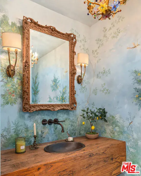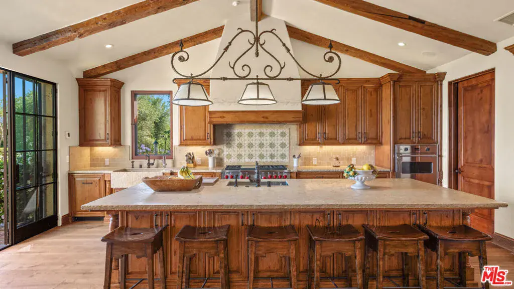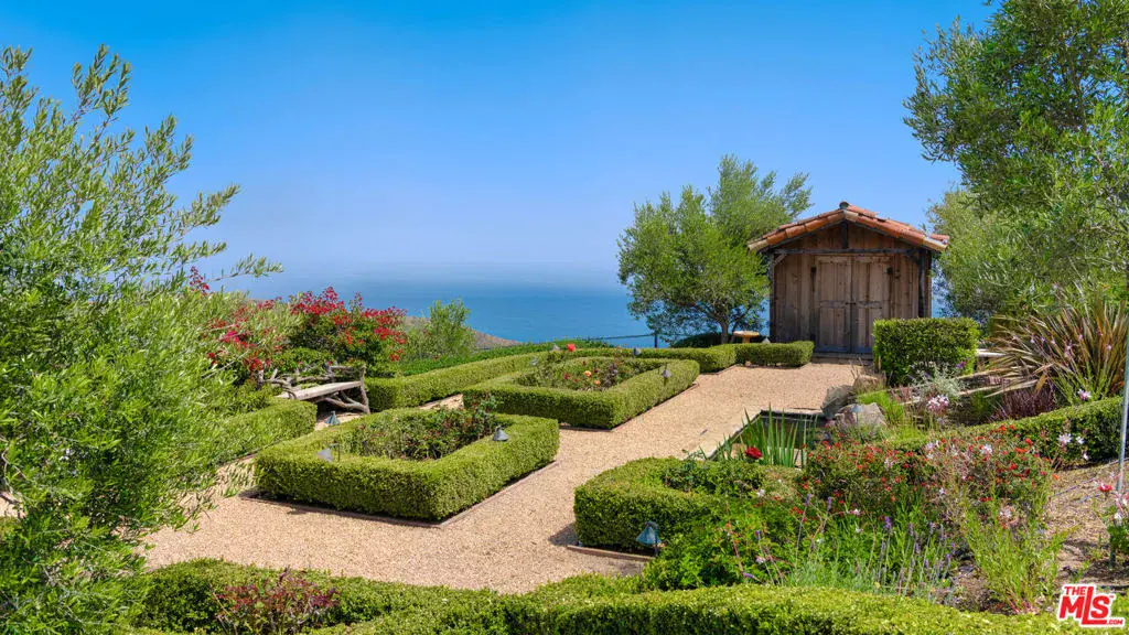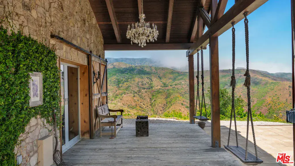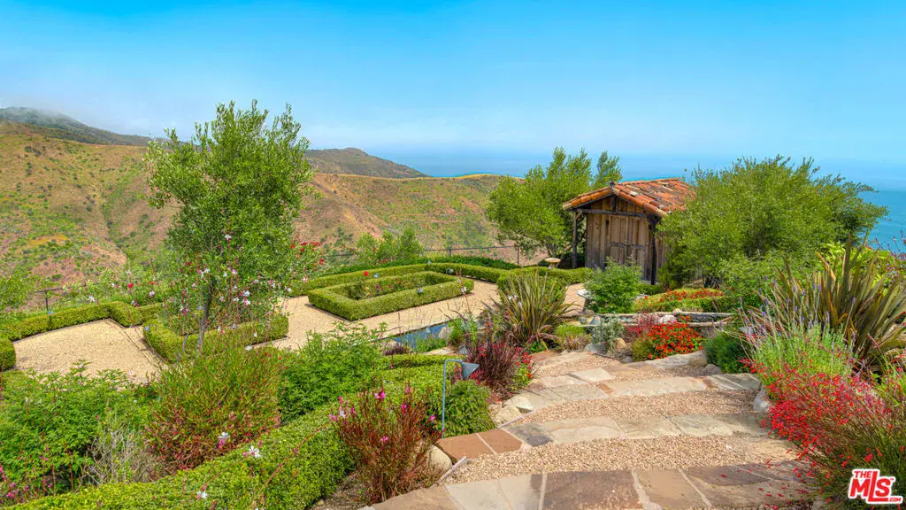 Tucked away behind gates atop the Malibu hills, this enchanting estate captures panoramic ocean and mountain views while evoking the timeless romance of a European countryside retreat. The approach unfolds along a long drive into a broad motor court with parking for 10+ cars, framed by lush gardens and anchored by a stone fountain.Inside, soaring wood-beamed ceilings, French doors, and gallery walls create a backdrop of warmth and elegance. The main living room is crowned by a monumental fireplace and flows to a formal dining room and chef’s kitchen, where custom cabinetry, a walk-in pantry, dual ovens, a Viking range, Wolf six-burner cooktop, and a large stone-topped island cater to both intimate evenings and grand entertaining. Nearly every room opens to patios, gardens, or terraces, merging the indoors with the property’s dramatic natural setting.The estate is designed with multiple wings for privacy. The primary suite features vaulted ceilings, a stone fireplace, and walls of glass that frame ocean and pool views. Its spa-inspired bath offers dual vanities, a soaking tub, and a large shower with multiple heads. Additional bedroom suites include private patios and marble-clad bathrooms, while a powder room delights with hand-painted lemon grove murals and a sculptural wood vanity. Beyond the main house, a detached office with vaulted ceilings, stone fireplace, reclaimed wood built-ins, and a wet bar creates the perfect studio or guest space. Across the court, a guest suite adjoins the garages, complete with wood floors, vaulted ceilings, en-suite bath, and French doors to a pergola-shaded patio. The outdoor living is extraordinary: a covered loggia with stone fireplace, alfresco dining, and heaters for year-round enjoyment; expansive lawns flowing to a long rectangular pool and spa with automatic cover; and terraced gardens with citrus groves, fountains, koi ponds, and box hedges. Meandering stone paths lead to a barn-inspired guest structure with a porch swing and firepit seating, all overlooking breathtaking ocean and canyon vistas. A professional-grade recording studio with soaring ceilings, custom acoustics, and a sound room enhances the estate’s versatility, offering creative refuge for artists and visionaries. Throughout the property, hidden seating areas, romantic pergolas, and layered gardens create a sense of discovery and retreat. Exquisitely landscaped and thoughtfully designed, 2900 Corral Canyon Rd is a rare Malibu estate that combines European elegance, coastal serenity, and boundless possibilities for living, entertaining, and creating.