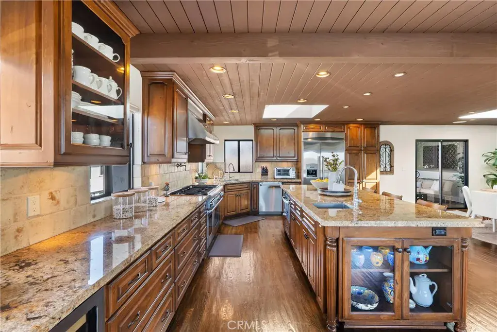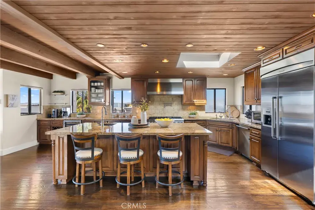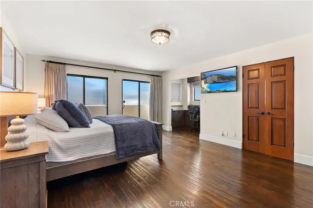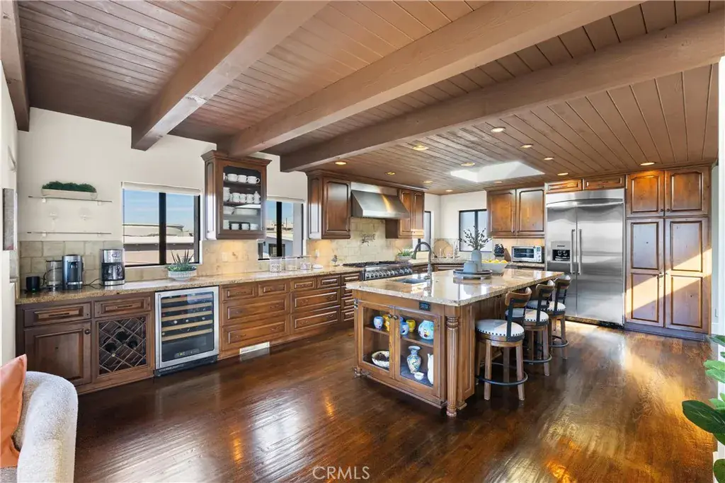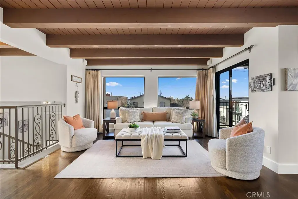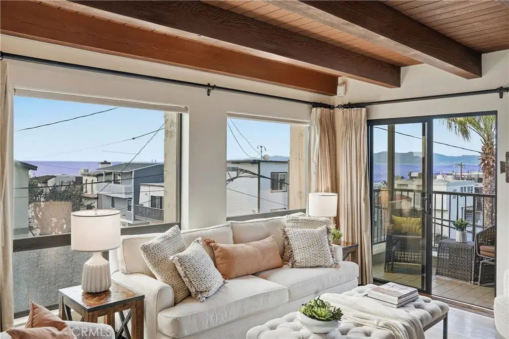 Outstanding value in the Sand Section of Manhattan Beach. This beautiful ocean view townhome has been meticulously maintained and exudes quality throughout. Situated on an oversized corner lot, this lovely home offers an open floorplan with ocean and mountain views from the living room, kitchen, dining room, and west-facing deck. The gourmet kitchen is a chef’s dream with a large center island, custom cabinetry, stunning stone counters, and stainless steel appliances. The kitchen overlooks the dining room and living area – great for entertaining or just enjoying life. This top floor also features wood beamed ceilings, skylights, solid hardwood floors (not engineered), skylight, a fireplace, an ocean view west facing deck, and a large private rear deck with BBQ hookups and is stressed to take a hot tub . The middle floor also features solid hardwood floors throughout and multiple balconies. The primary suite has a walk-in closet, balcony, and an ocean view office area. One of the guest bedrooms offers a beautiful built-in Murphy Bed. But wait, there’s more! An incredible BONUS ROOM is located behind the garage along with a bathroom and a very special craft room. Almost 400 sq ft of additional living space! Additional features include security system, air conditioning, electronic shades, solid wood garage door and front door, 5 decks, 4+ car parking too. This is an amazing home all within walking distance to the beach, shops, and restaurants.