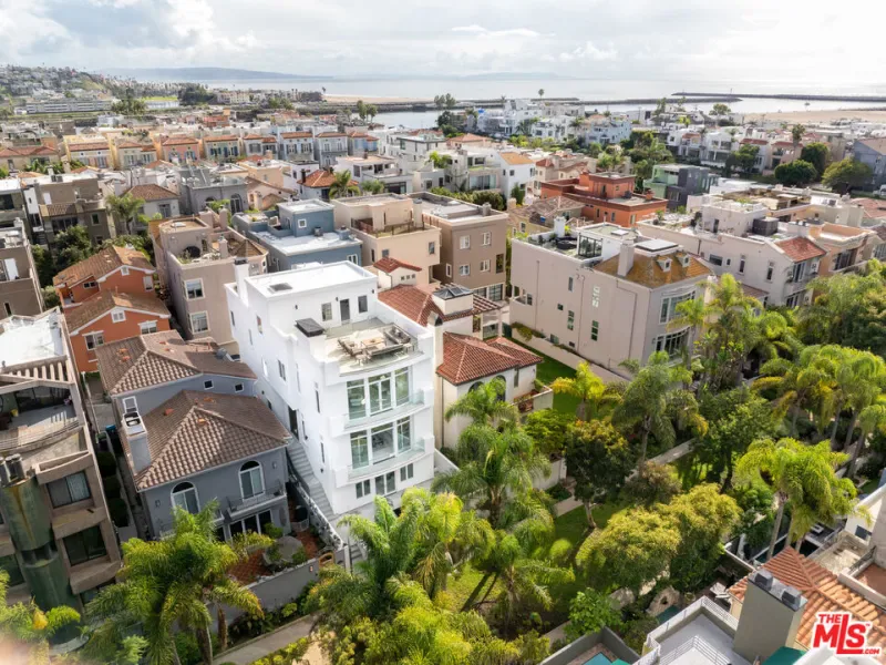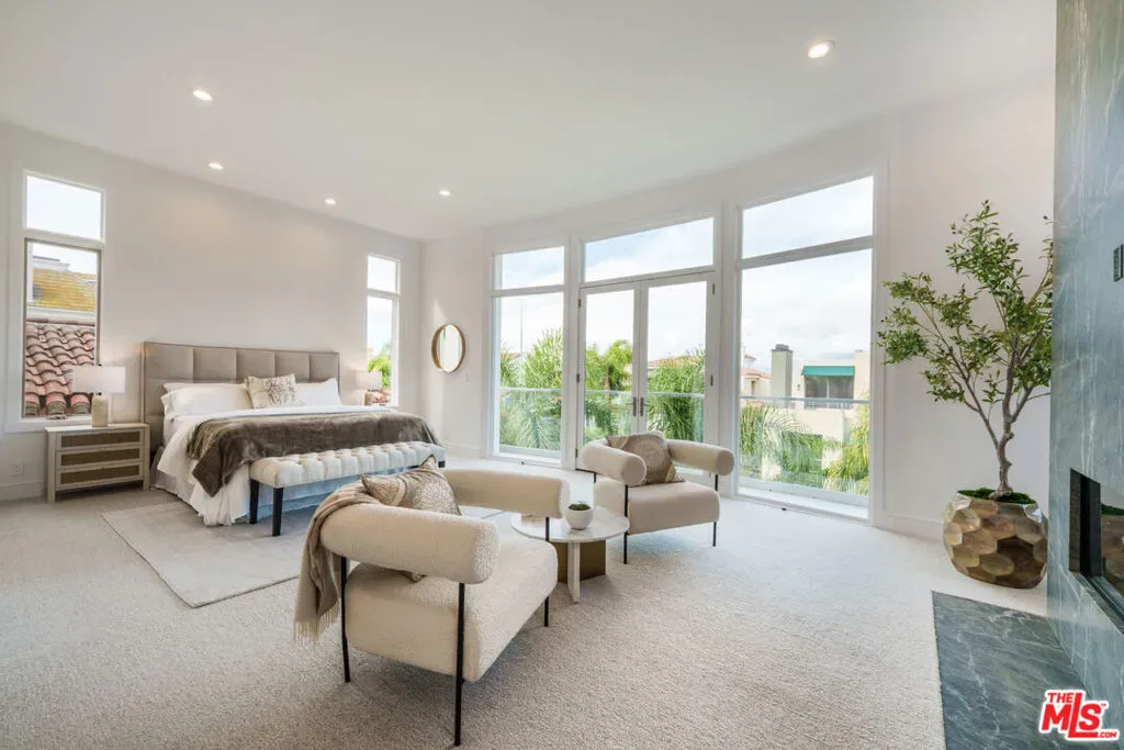 Recently completed multi-million-dollar renovation elevates this four-story architectural residence, discreetly nestled on a cul-de-sac walk street that evokes the serenity of a hidden park. This exceptional home offers an atmosphere of tranquility just steps from the beach and the Ballona Lagoon, and moments from the Marina’s premier dining, boutique shopping, theaters, and picturesque canal paths. Thoughtfully designed with 4 bedrooms and 5.5 baths, the residence showcases an open-concept layout bathed in natural light, featuring Onyx white porcelain tile floors, refined custom finishes, and recessed LED lighting throughout. The gourmet kitchen is a masterpiece of design, appointed with Quartzite Naica countertops, a waterfall island, marble Arabescato Silver Honed backsplash, luxe high-gloss and soft-close cabinetry with maple and birch interiors, and Wolf/Sub-Zero appliances. A sit-up island bar and adjoining kitchen dining area complete with a cozy fireplace and view patio create an inviting central gathering space that flows seamlessly into the butler’s pantry, spacious dining area, and living room with a stunning fireplace and a balcony overlooking the walk street park. The upper level is anchored by an expansive primary suite, offering a tranquil sitting area, private terrace with greenbelt park views, and a spa-inspired bath featuring white-oak cabinetry, Carrara marble accents, dual sinks, and a generous walk-in, designer closet. Two additional upstairs bedroom suites are enriched by natural light and elevated views. The first floor hosts a maid’s/guest suite and a large family room ideal for entertaining, with flexible space for an office, wine room, or playroom. A spacious private patio completes this level, providing an exceptional indoor-outdoor living environment. An elevator services all floors, including the top-level office/loft/gym/entertainment, flexible space, which opens to two expansive rooftop decks showcasing sweeping city, mountain, and peek-a-boo ocean views. Recent enhancements include new stucco, energy-efficient windows and doors, a PVC roof, updated landscaping and lighting, and a 3-car garage with new epoxy flooring. More than a home, this is a striking statement of modern design, comfort, and craftsmanship on the coveted Silver Strand.