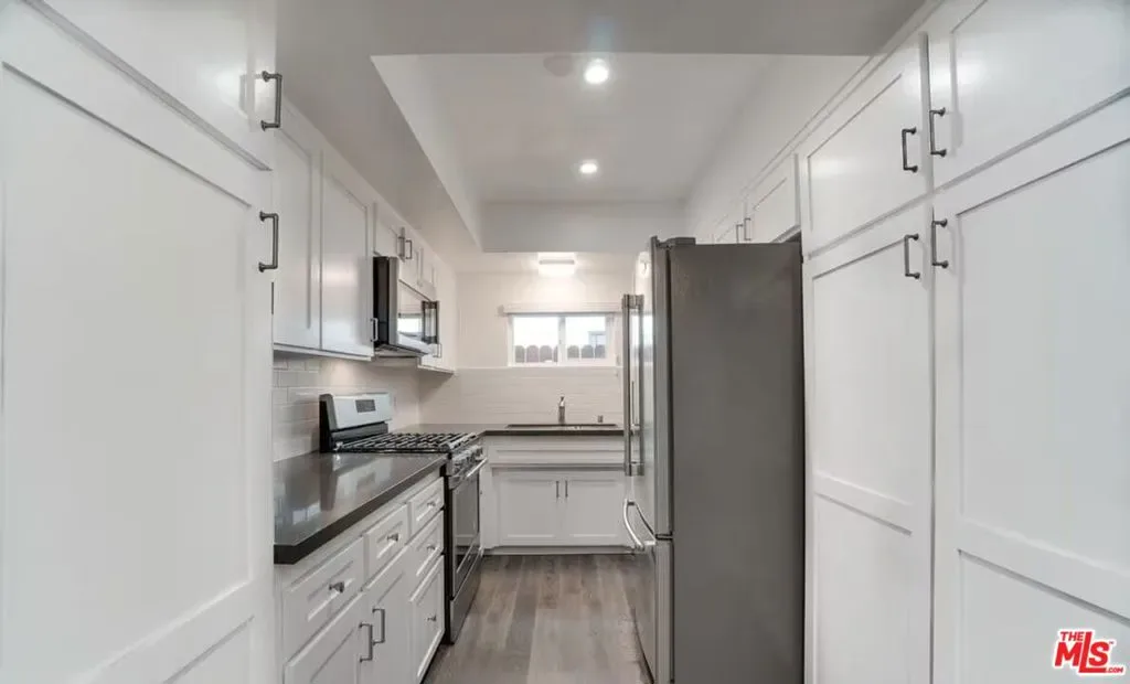 Modernized Beachside 3 + 2 garden apartment in an intimate duplex on the Marina Peninsula. This newly updated Bright & Breeze 2 level apartment features wood flooring, windows, recess lighting, and stainless kitchen appliances: stove, fridge, microwave, dishwasher along with Silestone counters and subway tile back splash. The airy open floor plan Living/Dining room with fireplace flows into a private enclosed front and side patio that is perfect for BBQ’s and entertaining. The architecturally designed stairway leads up to a 2nd level bedroom with private bath and Peek-a-boo view from balcony of the sand and ocean. Both first level bedrooms are comfortably sized with roomy closets. Additionally included is a single car garage featuring epoxy floor, garage door opener w/ remote, 2 extra parking spaces (1 carport), washer/dryer in garage. Surf the waves, amble on the open beach and live a stone’s throw from fabulous restaurants, shopping and nightlife.