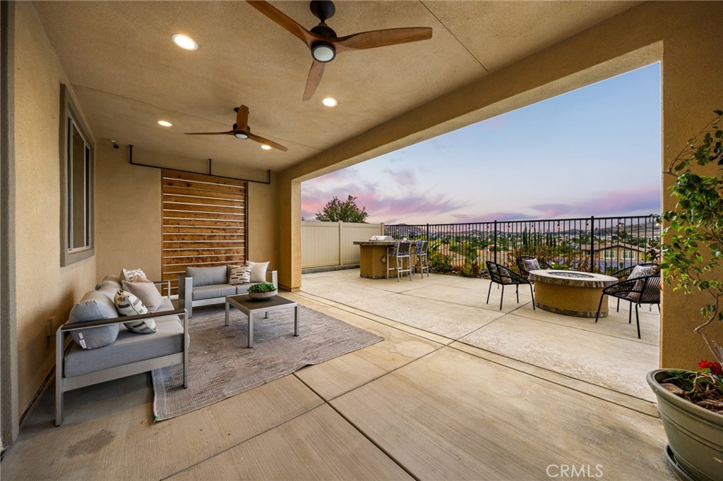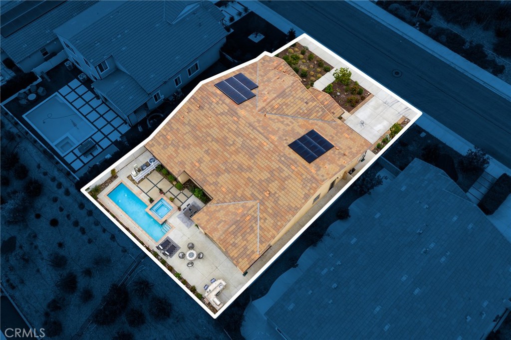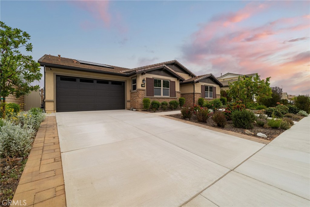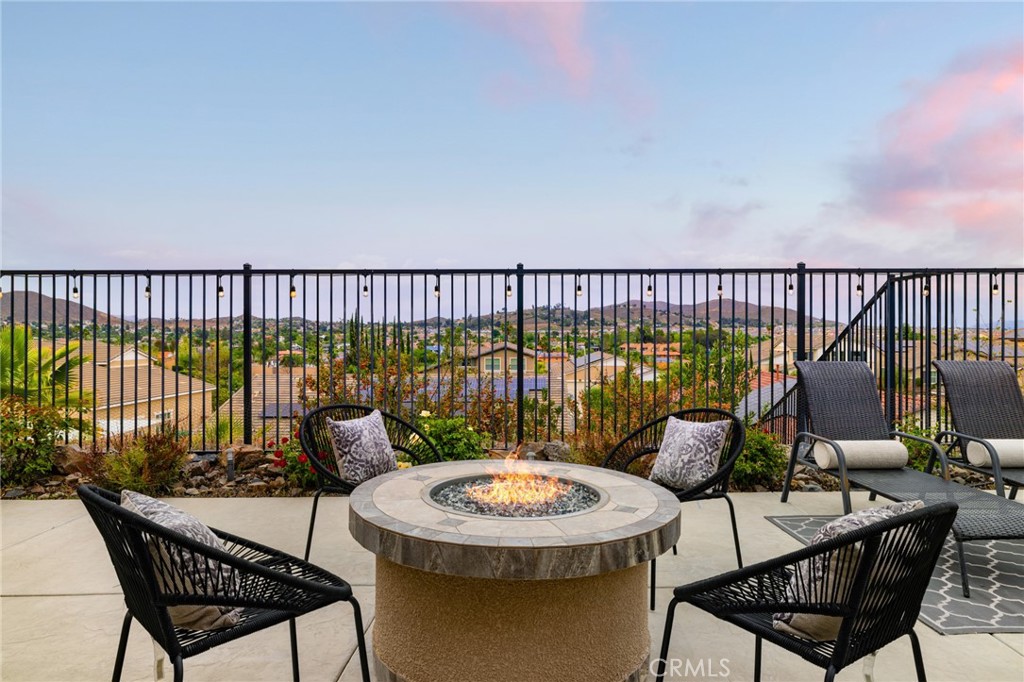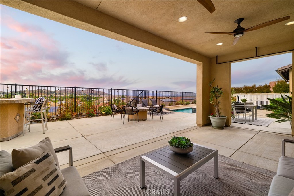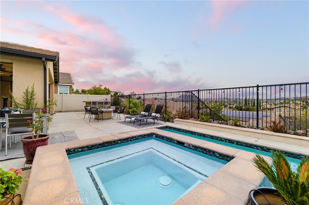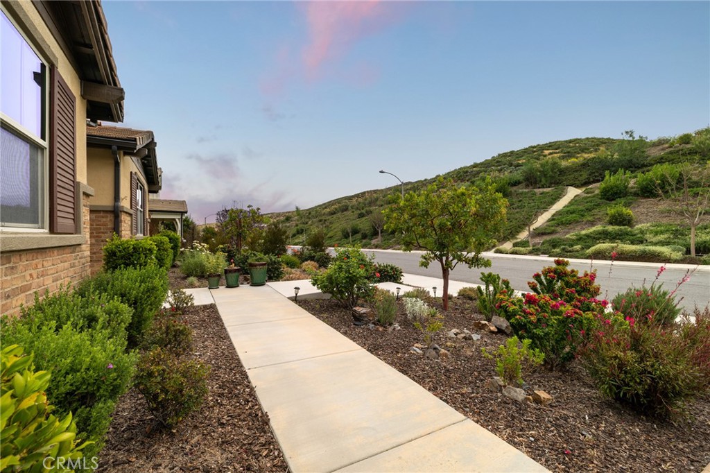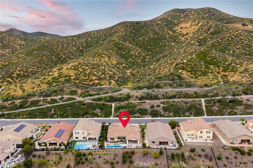 A luxury pool home awaits you in the gated community of Province at Audie Murphy Ranch, in Menifee, boasting hundreds of thousands in designer upgrades and breathtaking mountain views. This one-of-a-kind home offers 4 bedrooms, 2.5 baths, an office, owned solar plus Tesla battery, a 26′ long lap pool, 10-person spa, Govee lights and extra electrical throughout the home. The exterior of this ranch style property boasts drought tolerant landscaping and custom steps up to the quaint porch overlooking the hillside. A beautiful custom glass front door and retractable screen greet you into the home offering tall ceilings, tile floors, custom paint, recessed lighting, crown molding, custom window coverings throughout and a highly desirable floor plan. Off the entrance of the 3100 sqft property are two large secondary bedrooms with walk-in closets, one with a built-in bookshelf which share a secondary bath featuring dual sinks and a shower tub combo, that sits across from a powder bath. A junior suite offers an extra-large bedroom with a massive walk-in closet, built in bookshelves and would be the perfect game room. The Great Room features a custom stone fireplace with heat protected floating mantel, built-in open cabinets and floating shelves and large view windows. The dining room offers a quiet cool whole house fan. The gourmet kitchen features granite counters, subway tile backsplash, an eat-up island, stainless steel appliances, wine fridge, wine rack and large walk-in pantry with extra shelves built-in. Behind the kitchen is an open office boasting a shiplap wall, built-in bookcase and phone-controlled ceiling fan. The butler’s pantry is upgraded with glass front cabinets across from the 3-car tandem garage offering a custom work bench, 120 and 210 capabilities. The laundry room boasts a wash sink, folding area and tons of storage! Just off the Great Room is the Primary Bedroom with custom paint, an attached bath boasting a walk-in shower, soaking tub, dual vanity, built in linen area and large walk-in closet with premium built-in organization. The entertainers yard boasts a large CA Room with recessed lighting, ceiling fan, wood wall for privacy, gas fire pit, built-in BBQ with sink and fridge, solar activated lighting, cumquat and lemon trees. The Community features pools, spas, sports courts, club house, trails, skate park, Elementary and Middle schools & is between the 15 & 215 fwys, close to shopping & the wineries!