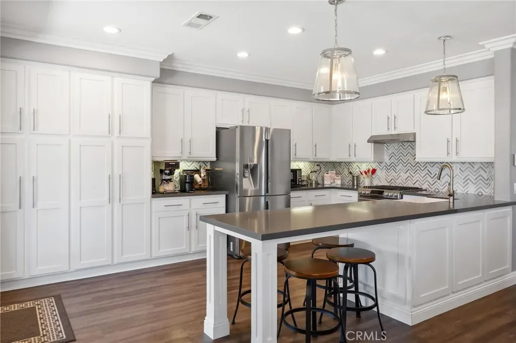 The remodeled kitchen is a standout, showcasing white shaker cabinetry, sleek quartz countertops, stainless steel appliances, and a generous peninsula with bar seating – providing the ideal space for casual meals and gatherings.