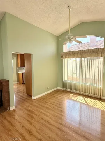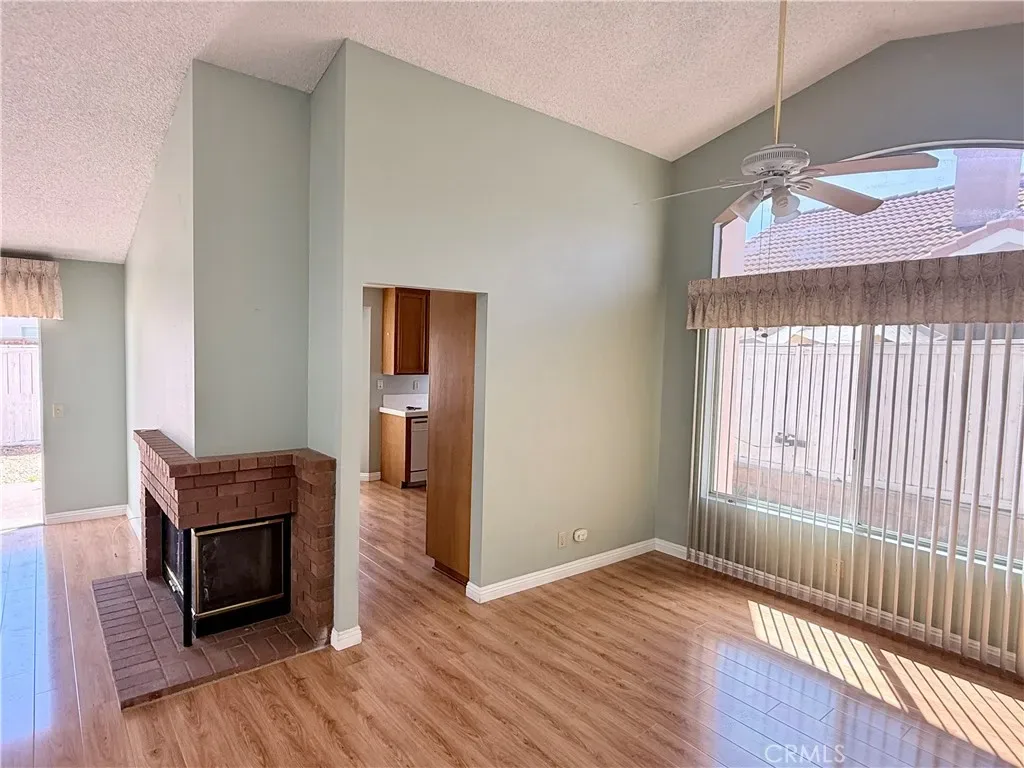 This charming single-story residence offers a bright and open floor plan with spacious living areas filled with natural light. The inviting living room features vaulted ceilings and a cozy fireplace, flowing seamlessly into the dining area and kitchen, which includes ample cabinetry and a comfortable breakfast nook—perfect for everyday living.