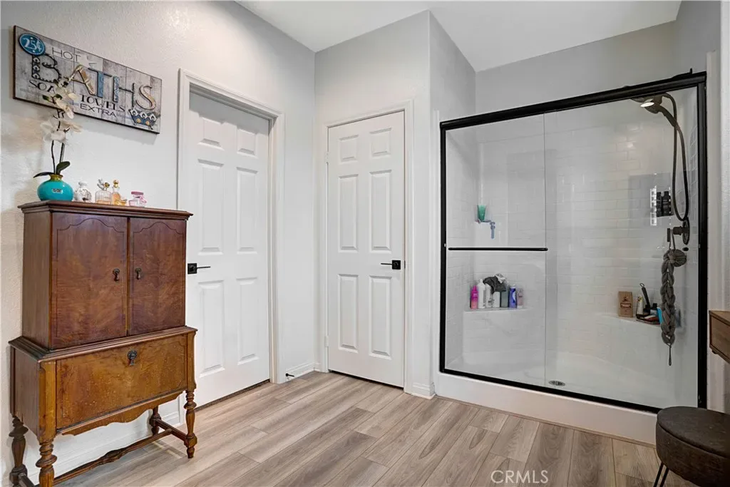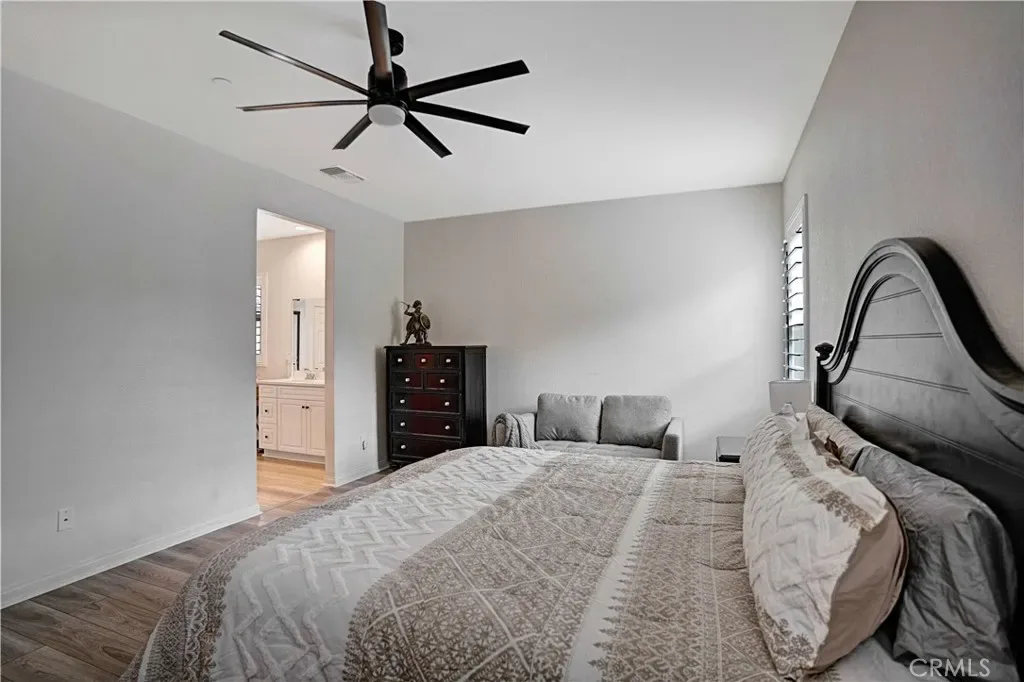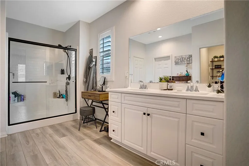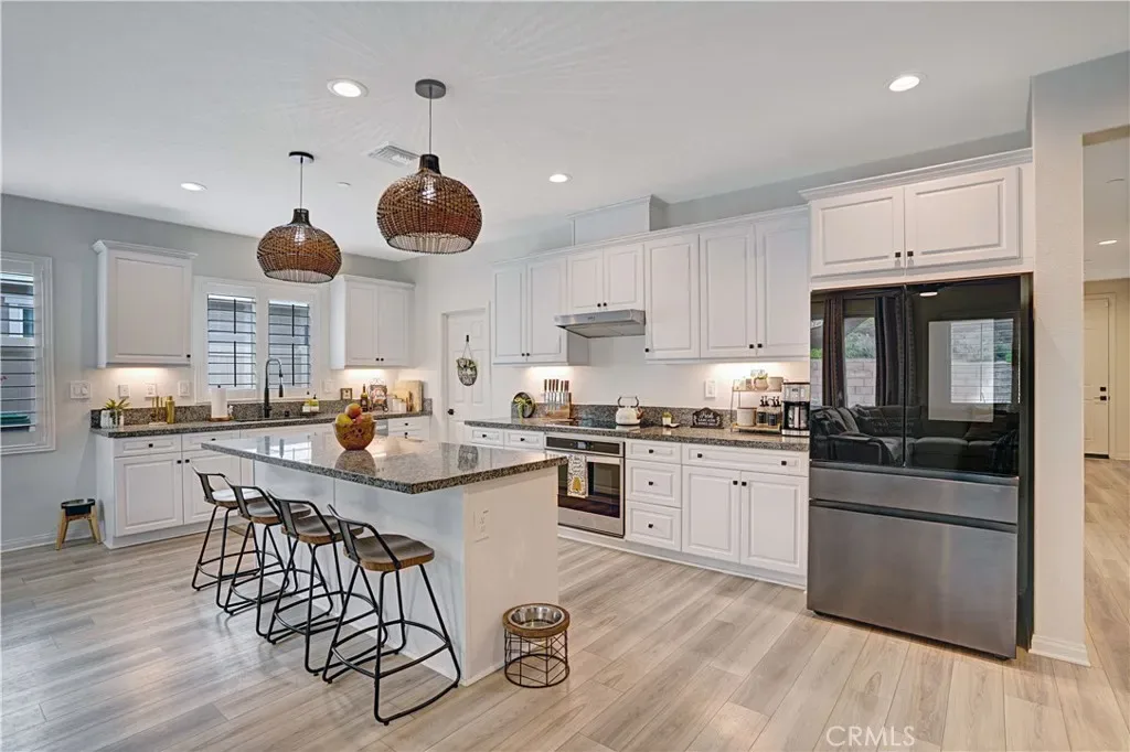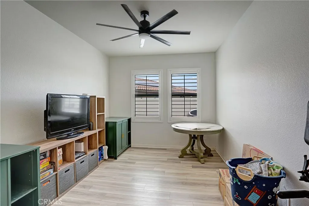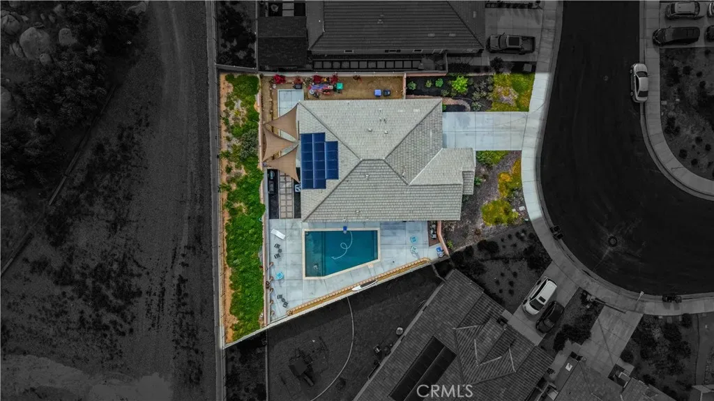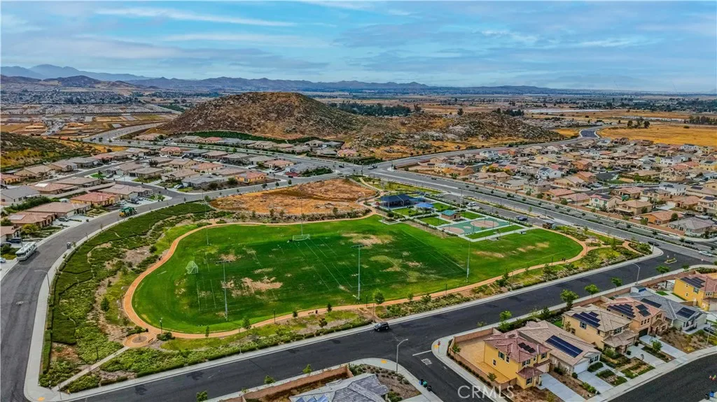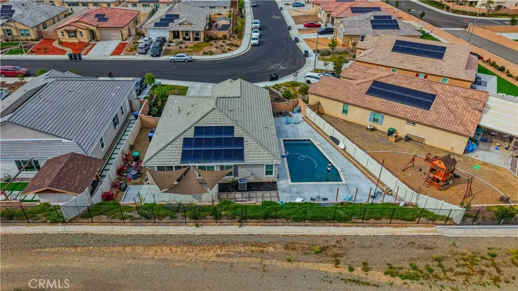 Single Story Pool Home in Menifee located in an all electric community of Shadow Mountain with low HOA. This home offers 3 bedrooms 2 bathrooms and a centrally located den/office/possible 4th bedroom. The upgraded kitchen showcases a large island, convection oven, walk-in pantry, shaker cabinets with black hardware opening seamlessly to the main living area with surround sound and dining area to double door sliders to backyard. Interior highlights include luxury vinyl plank flooring throughout, plantation shutters, and an upgraded allergy-conscious ventilation system. The master bedroom has tons of natural light and large master bathroom with black trim walk-in shower and walk-in closet. All guest bedrooms feature walk-in closets. Enter the landscaped backyard with concrete patio, side yard storage and a full separate side yard with a pebble tec dark bottom pool, baja shelf with two umbrella slots. The property also offers possible RV parking on the side if parked behind the gate. The property has solar and close to tons of parks, schools and shopping!